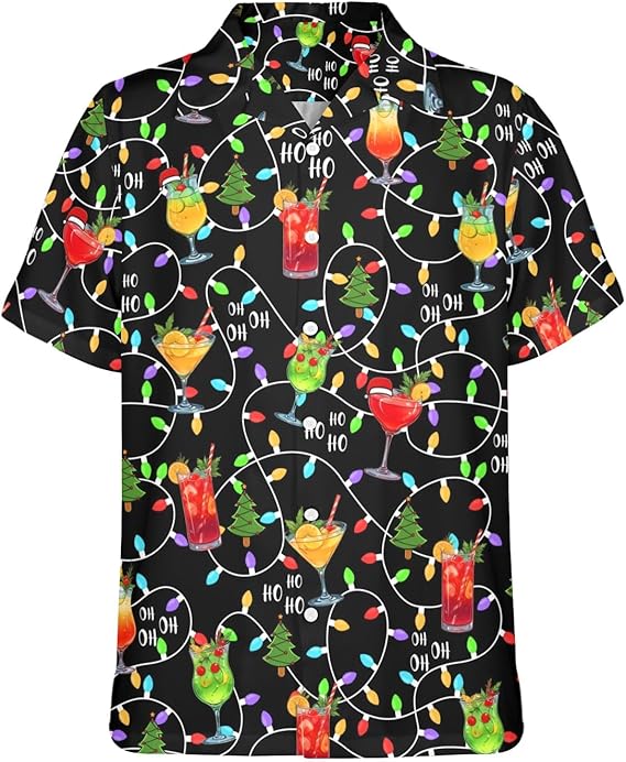 Featuring a lively print of festive fruit drinks, Christmas lights, and holiday decorations, it brings fun and energy to any occasion. Ideal for Christmas parties, tropical vacations, or casual gatherings, this shirt adds a whimsical and festive touch to your wardrobe.