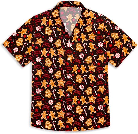 Featuring an all-over print of adorable gingerbread cookies, candy canes, and festive motifs, it captures the warmth and nostalgia of the holiday season. Whether you’re attending a Christmas gathering, hosting a holiday BBQ, or heading to a tropical vacation, this shirt keeps your style lighthearted and merry.