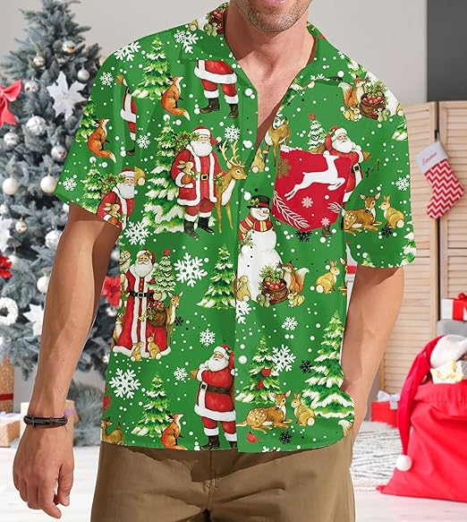 Featuring a lively print of iconic holiday motifs such as Santa Claus, reindeer, Christmas trees, and ornaments, it brings festive cheer to any occasion. Perfect for Christmas parties, tropical vacations, or casual family gatherings, this shirt adds a fun and stylish touch to your holiday wardrobe.