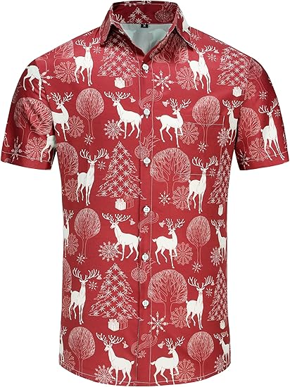 Featuring a lively print of Santa Claus, reindeer, Christmas trees, and holiday decorations, it captures the joyful spirit of the season. Perfect for Christmas parties, family gatherings, or tropical vacations, this shirt adds color, personality, and festive charm to any occasion.