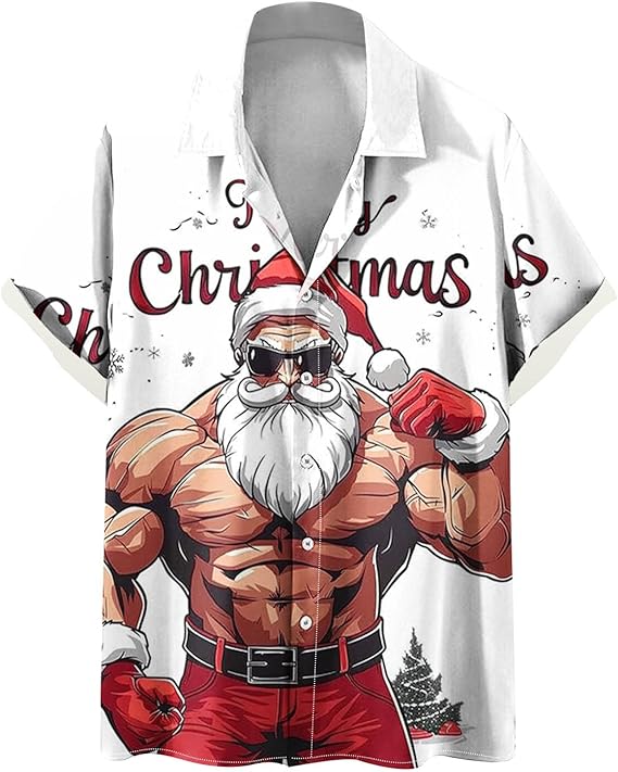 Featuring a lively print of a strong, cheerful Santa Claus surrounded by holiday motifs, it captures the fun and energy of the season. Whether you’re attending a Christmas party, enjoying a tropical vacation, or hosting family gatherings, this shirt keeps you stylish, comfortable, and full of holiday spirit.