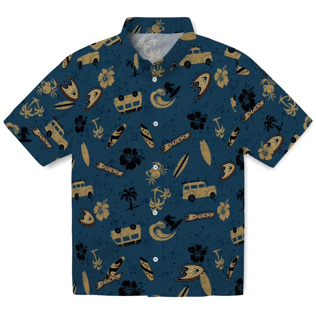 Eye-catching tropical Hawaiian prints combined with the Anaheim Ducks logo.