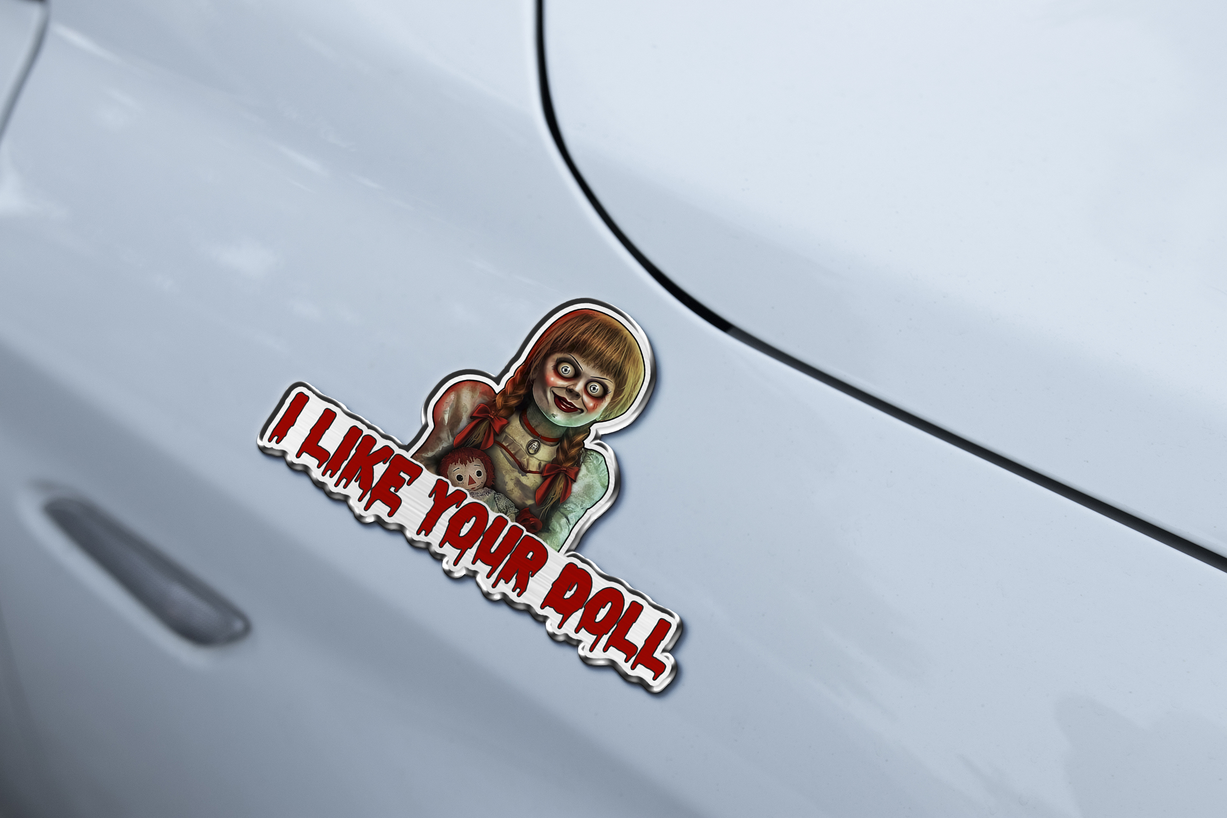 Turn your vehicle into a haunted artifact with this laser-engraved Annabelle car emblem—made for horror fans who embrace the darkness, the fear, and the unsettling charm of cinema’s most chilling doll. Whether you’re creeping through foggy streets or parking under a full moon, this badge makes your car scream one thing: do not touch.