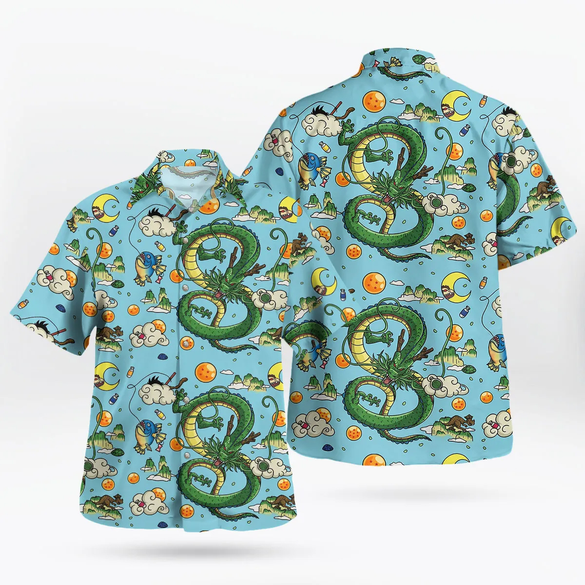 The Shenron, the mystical dragon who grants wishes, is brought to life on this vibrant aqua blue Hawaiian shirt. With bold graphics of Shenron intertwined with tropical designs, it’s the ultimate way to show off your love for Dragon Ball Z in a bold, fashionable way. The fusion of anime, iconic imagery, and a laid-back Hawaiian style makes this shirt stand out in every setting.