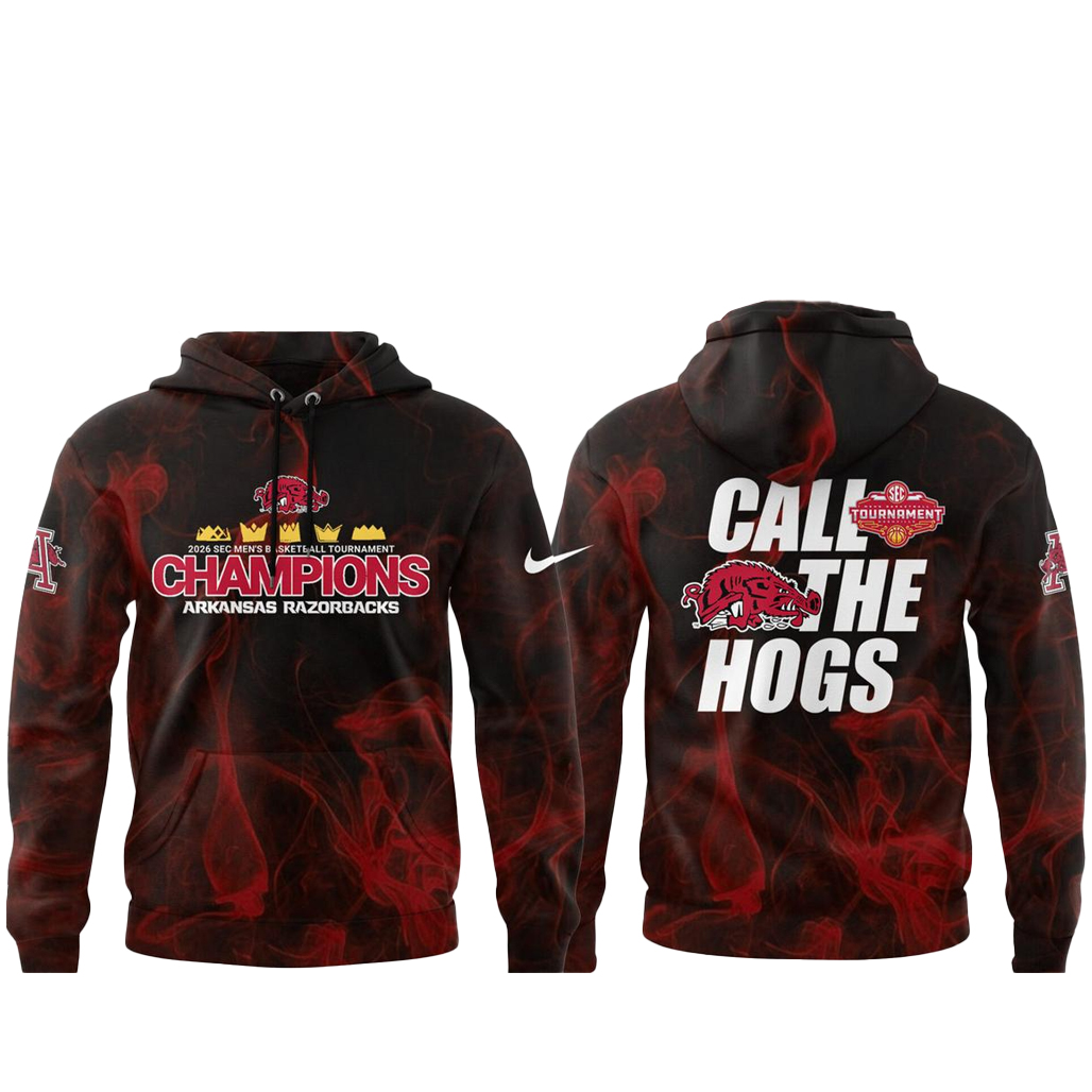 Featuring bold “SEC Tournament Champions 2026” and “Call The Hogs” graphics that capture Razorbacks spirit and victory.