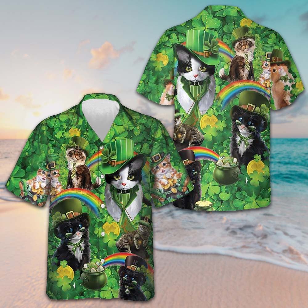 Cats Saint Patrick’s Day Hawaiian Shirt Shamrock Button Down Shirt Gifts For Irish Cat Lovers