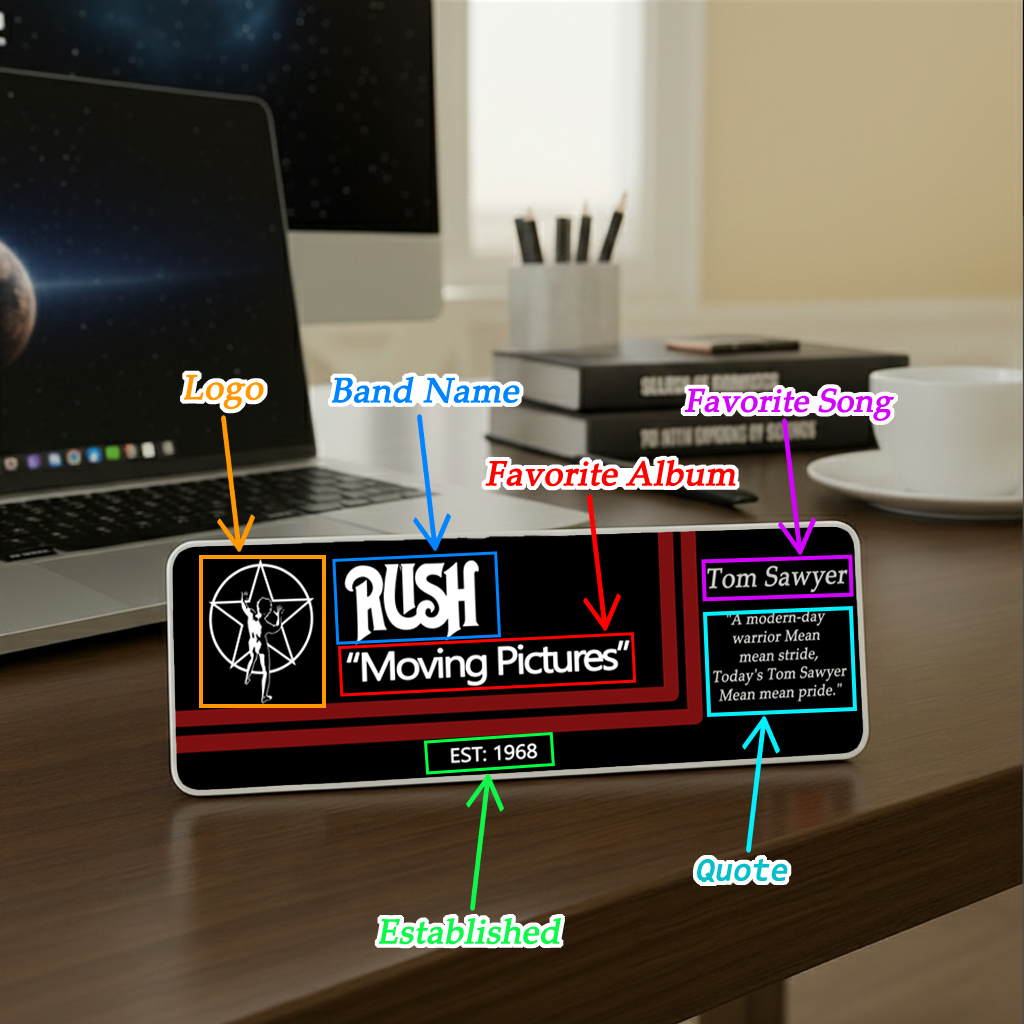 Bring your music passion to life with this Custom Band Desk Plate — a bold, stylish display piece designed for fans of any genre, any era, any band. Perfect for desks, studios, office doors, music rooms, or collector spaces, this plate adds a personal touch of rock, metal, pop, or indie identity to your setup.