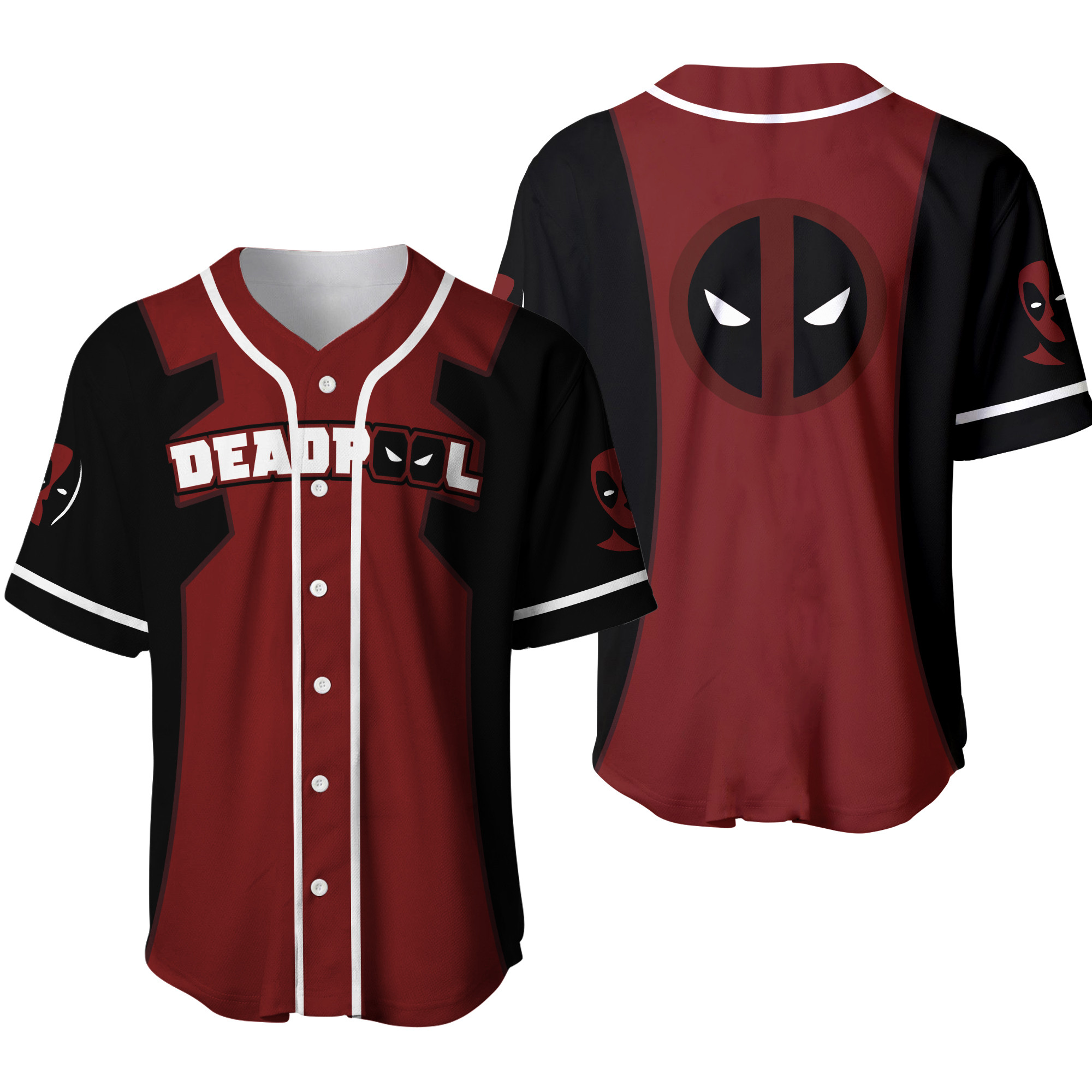 Design: Button-up baseball jersey with Deadpool graphics