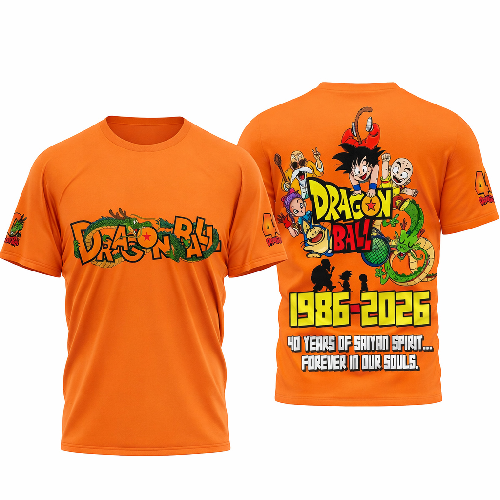 Marking the 1986–2026 milestone, this shirt captures the spirit of adventure, resilience, and growth that made Dragon Ball a timeless phenomenon across generations.