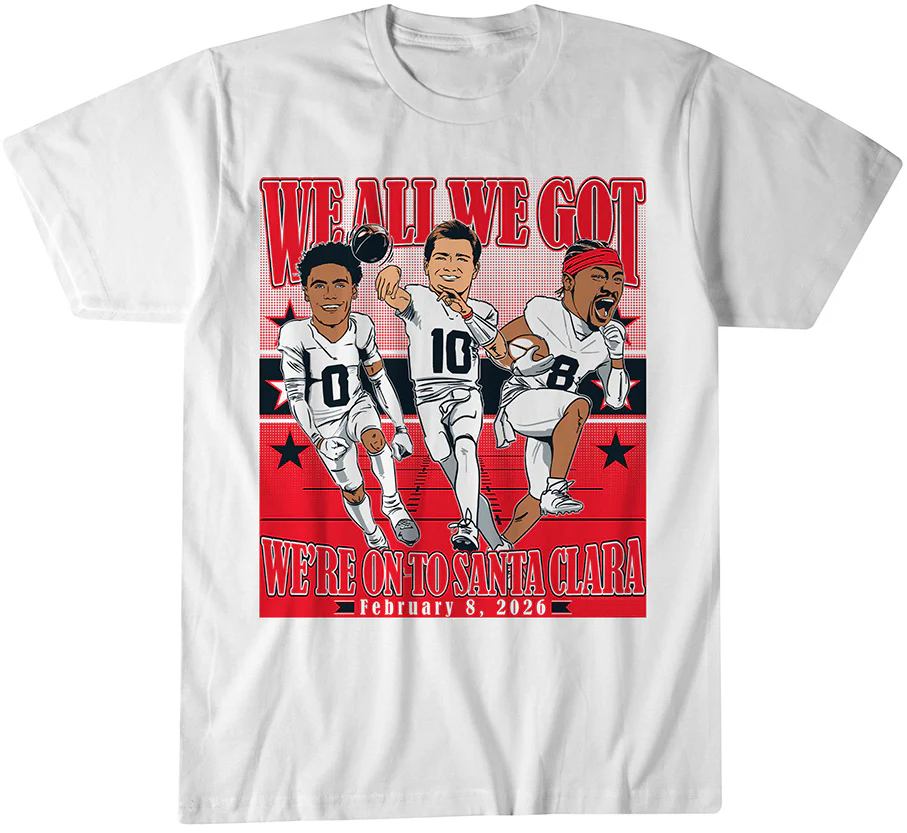 Featuring a striking “We All We Got — We’re On To Santa Clara” graphic with Maye, Diggs, and Gonzalez at the forefront, the design highlights the heartbeat of the Patriots’ postseason run: belief, chemistry, and unshakeable confidence. Whether you’re cheering at Gillette Stadium, gearing up with friends for the next matchup, or adding a powerful playoff piece to your Patriots collection, this shirt puts the moment and the team’s core leaders front and center.
