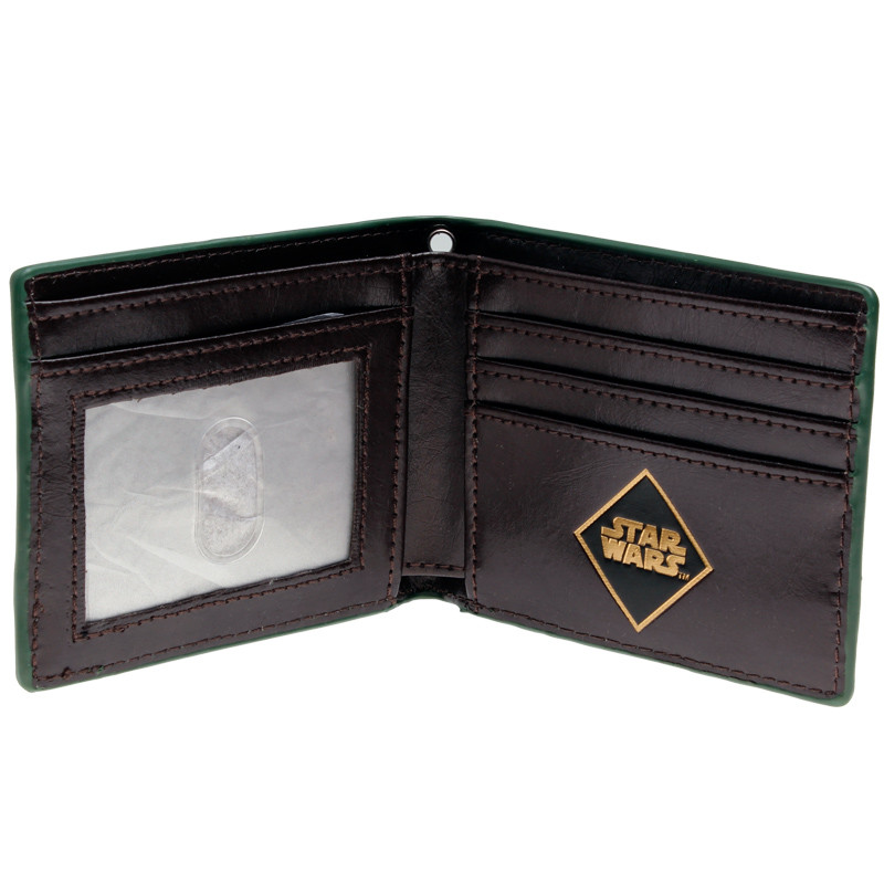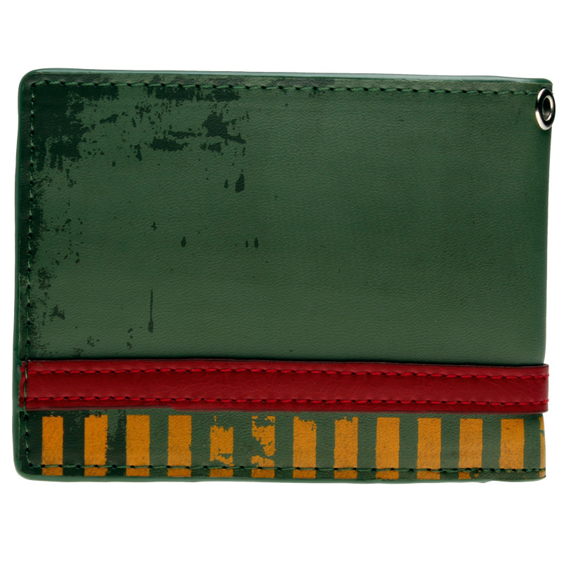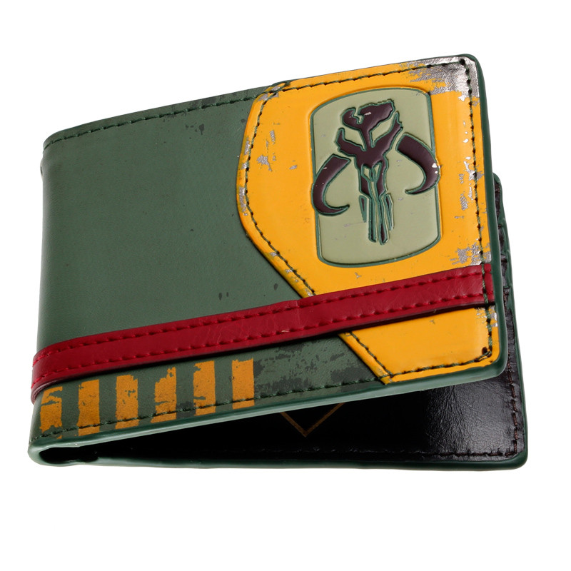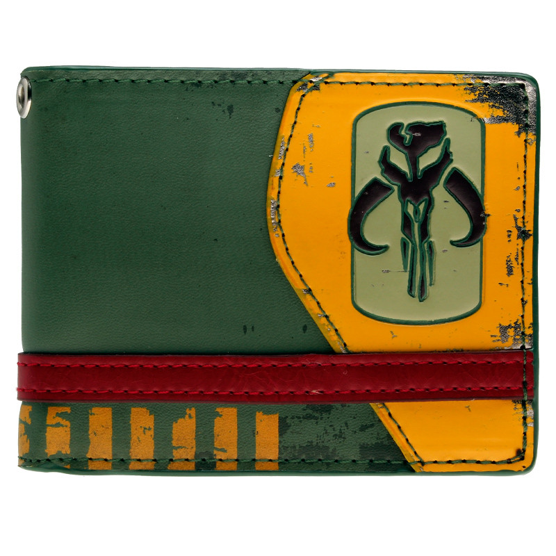 This 4.25 inches wide by 3.5 inches high Star Wars Mandalorian Symbol Bi-Fold Wallet looks amazing and was inspired by Fett himself. It has a Mandalorian symbol and the color scheme of Boba Fett.