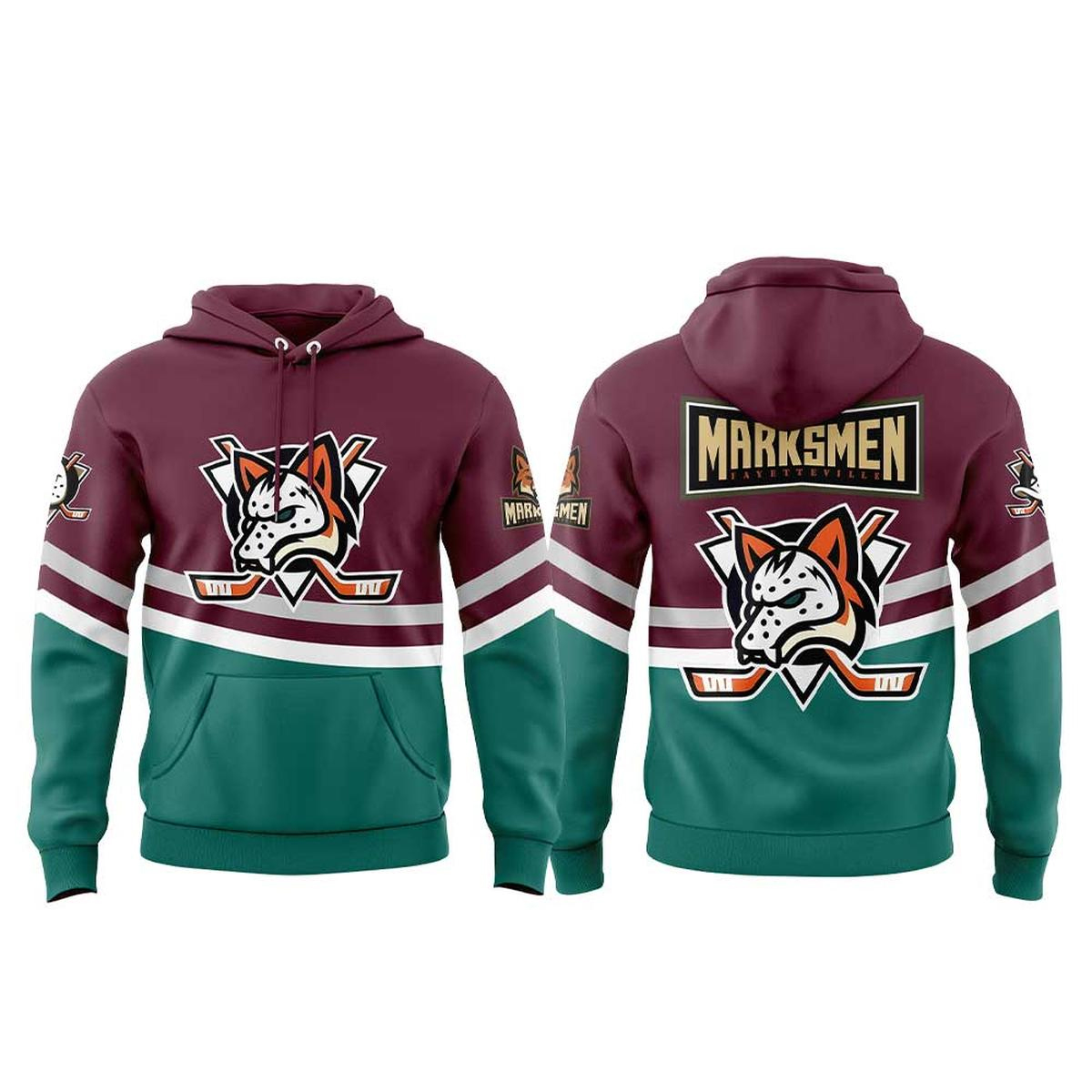 This design blends Fayetteville Marksmen identity with the fun, nostalgic spirit of The Mighty Ducks. Whether you grew up on the movies or simply love a standout theme night, this set captures the excitement and energy of 2026’s special celebration.