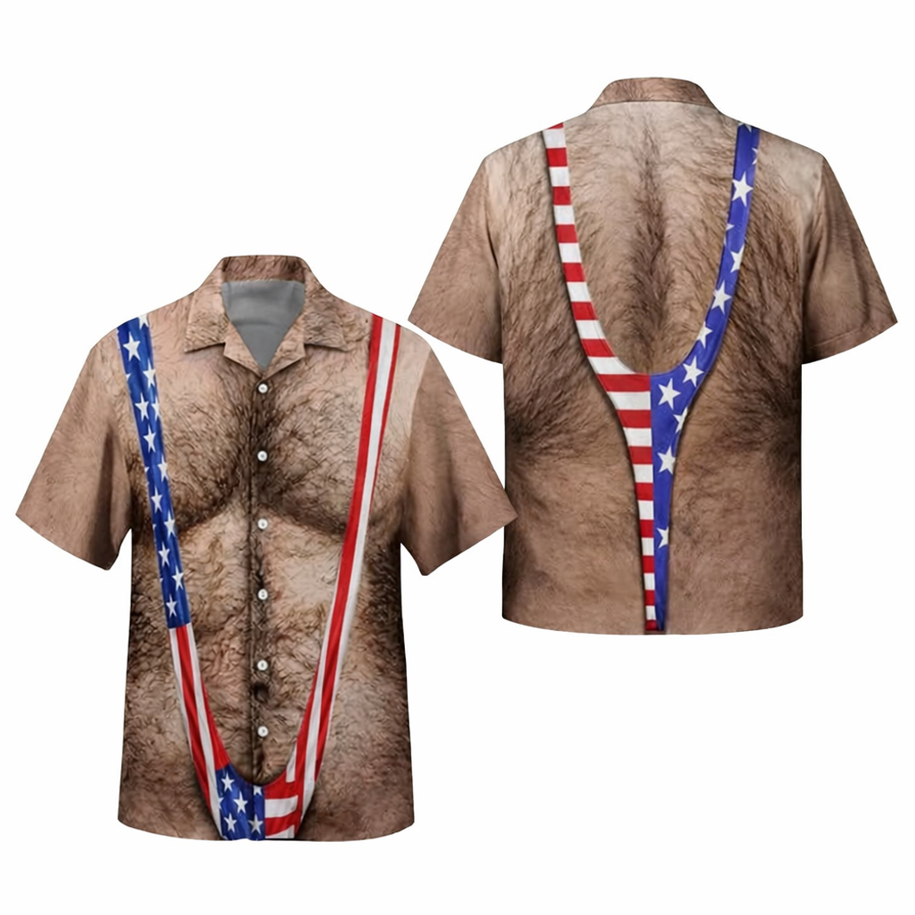 A hilarious hairy chest print combined with the American flag for a unique and eye-catching look.