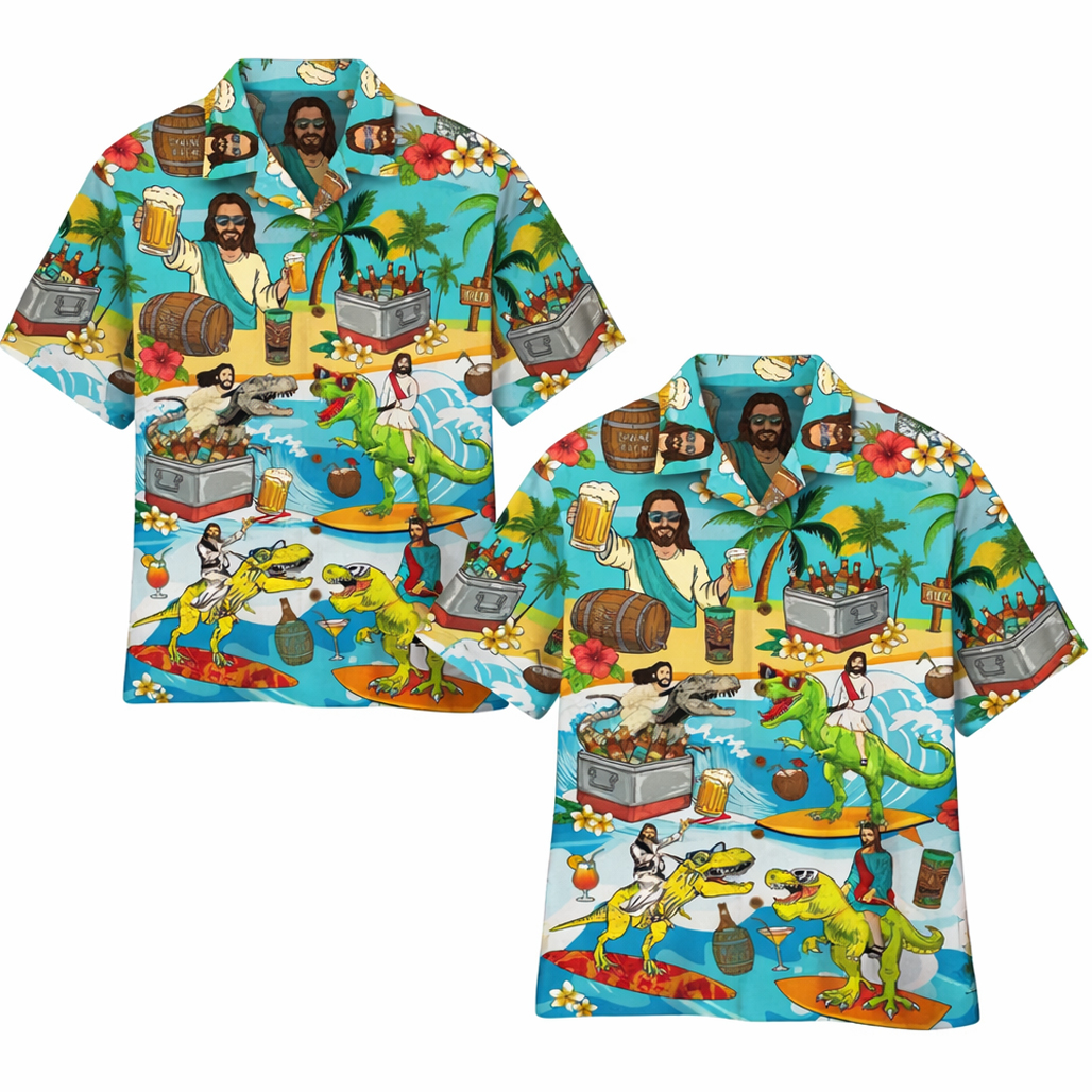 Funny Jesus Riding Dinosaurs Hawaiian Shirt