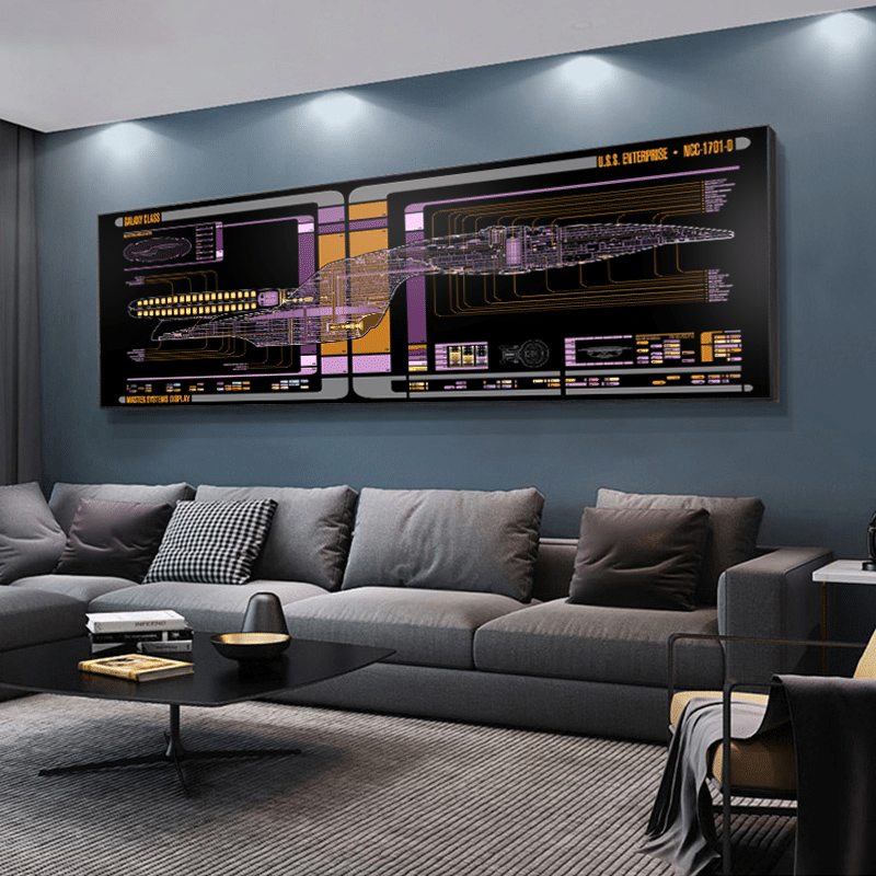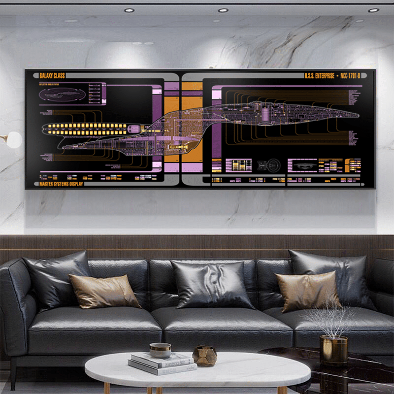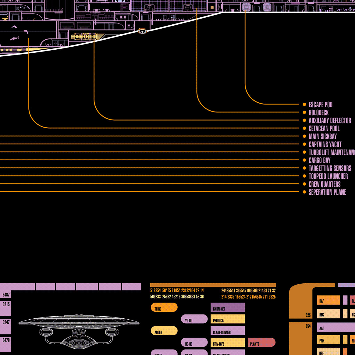 The central computer display of the U.S.S Enterprise Galaxy Class starship from The Next Generation Movies. Features every deck and central system on board. Highly detailed with design and color scheme from the movies. Also features other key LCARS system displays. Navigation, Warp, Computer Core, Photon Banks, and Sensors.