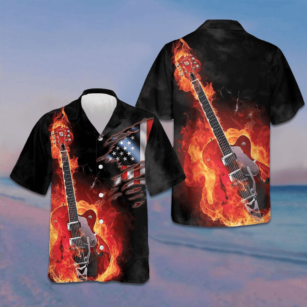 Guitar On Fire Hawaiian Shirt American Flag Button Up Shirts For Men Gifts For Guitar Lovers