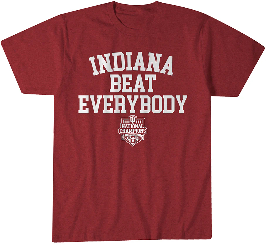 Graphic: Bold “Indiana Beat Everybody – 2025 CFP National Champions” design featuring Hoosiers colors and football-inspired artwork.