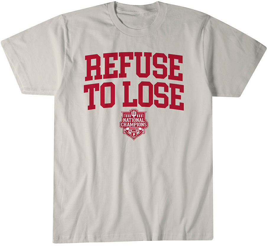 Graphic: Bold “Refuse To Lose – 2025 National Champions” design featuring Indiana Hoosiers colors and football-inspired artwork.