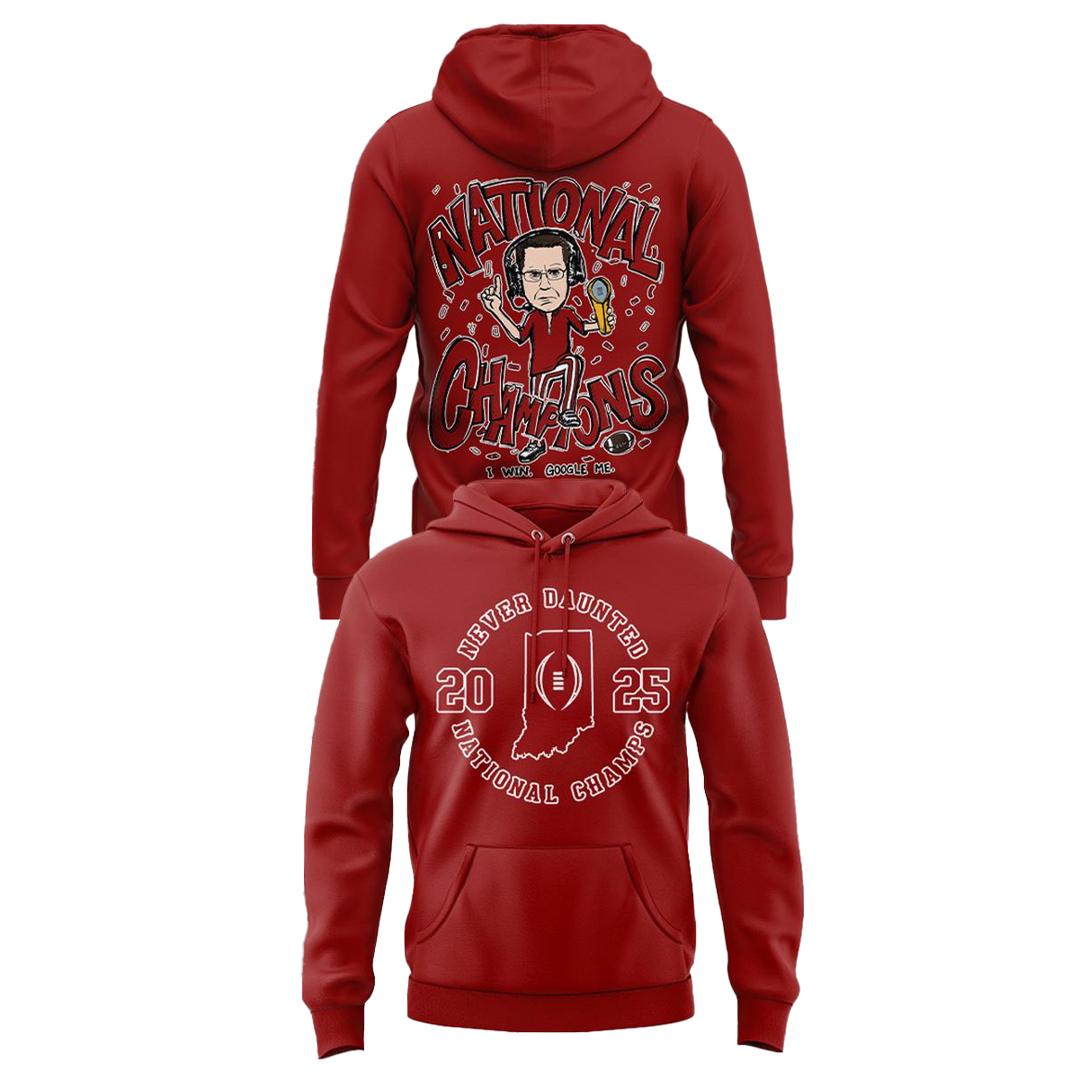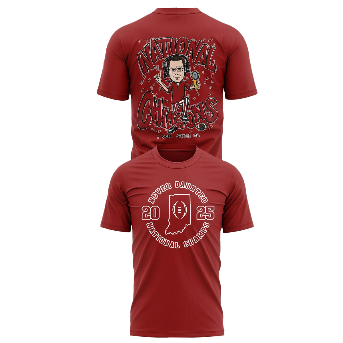 Graphic: Bold “I Will Google Me – 2026 National Champions” design featuring Indiana Hoosiers colors and football-inspired artwork.