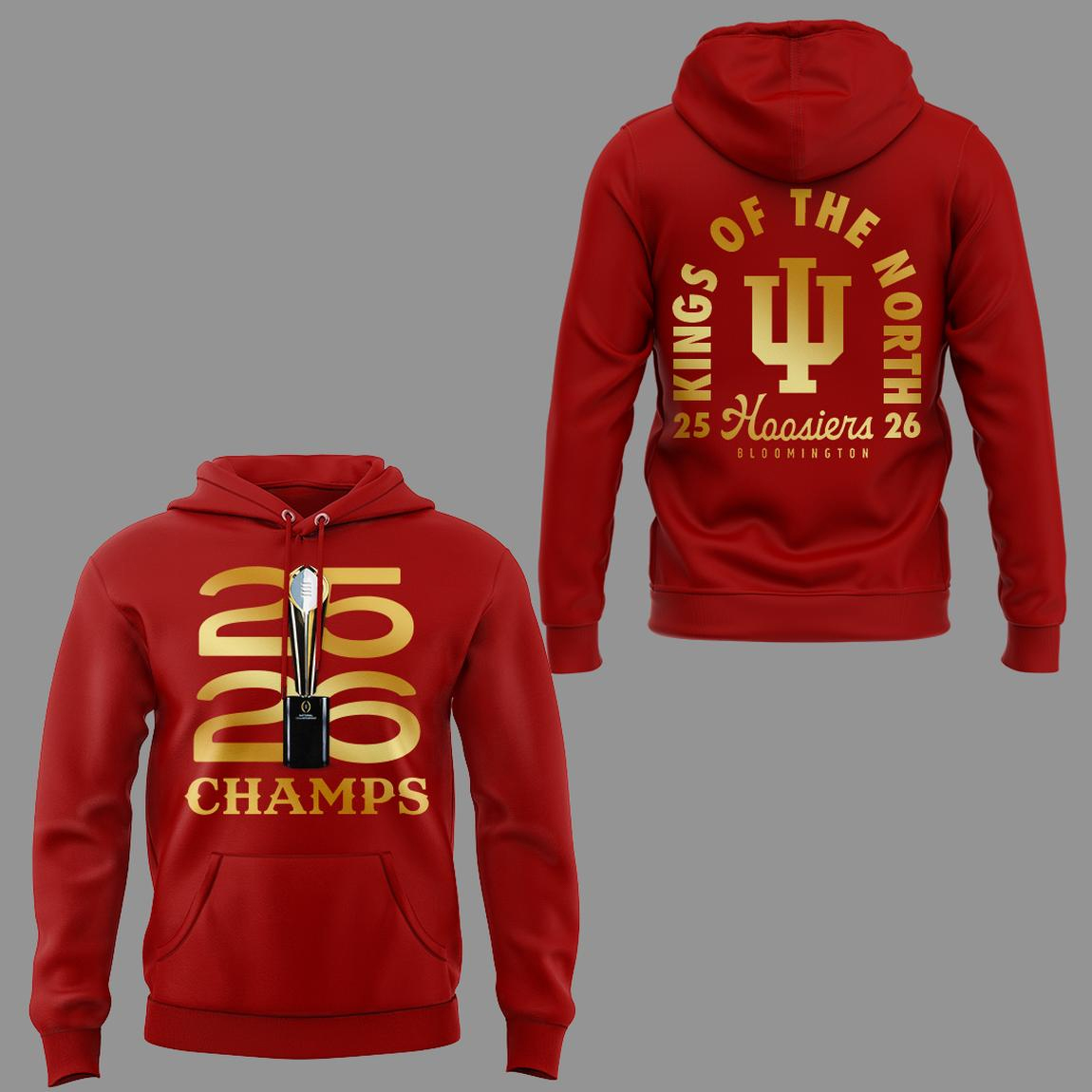 Graphic: Bold “King Of The North – 2026 National Champions” design featuring Indiana Hoosiers colors and football-inspired artwork.
