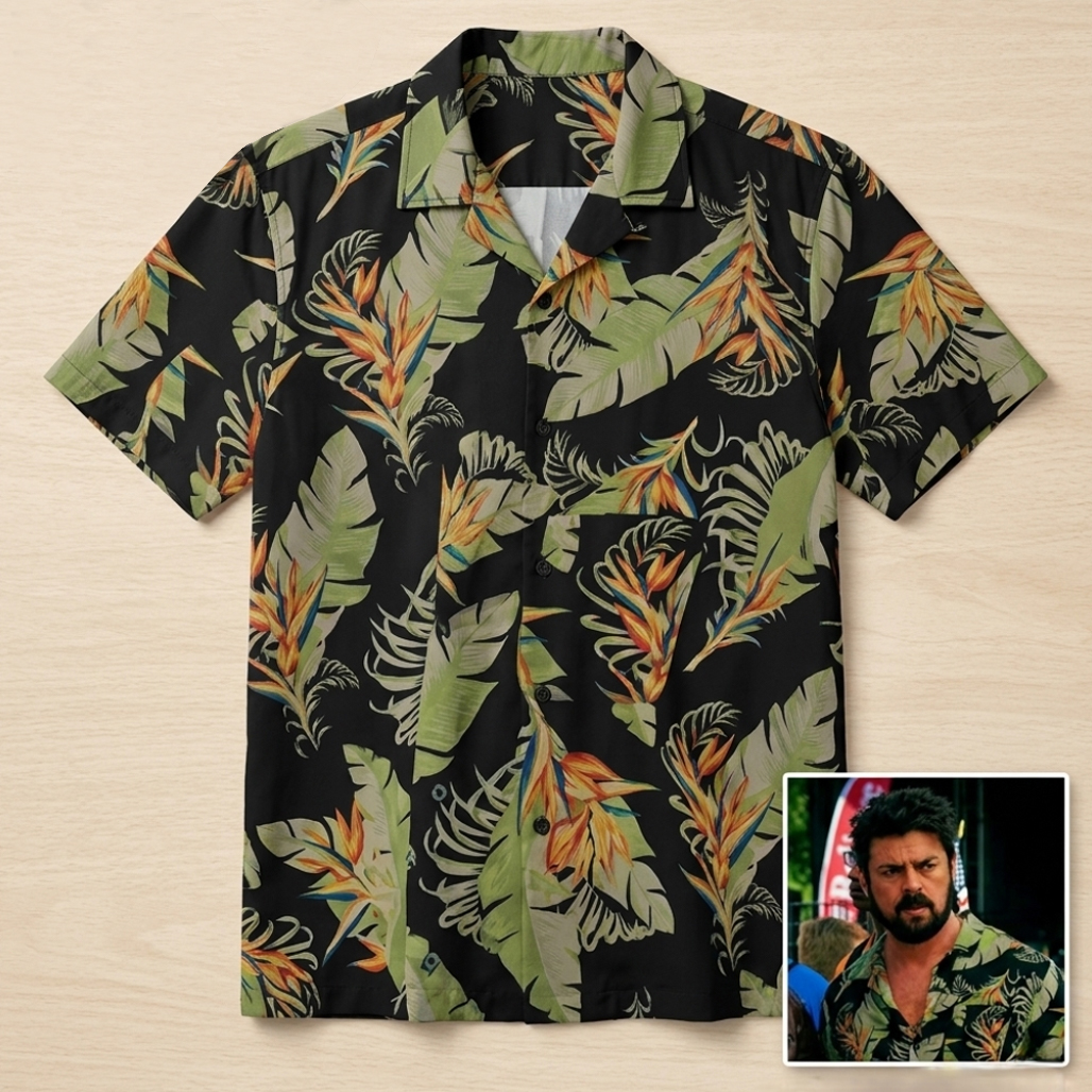 Inspired by Billy Butcher’s iconic look, this shirt blends edgy character energy with relaxed tropical style for a standout statement.