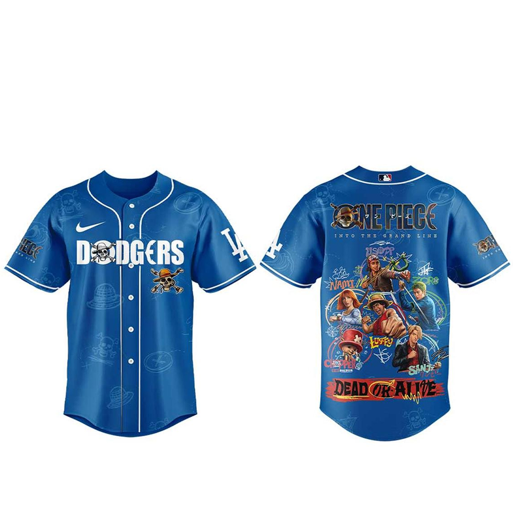 Set sail with bold style in the Los Angeles Dodgers One Piece 2026 Dead Or Alive Baseball Jersey. This striking design blends Dodgers pride with the adventurous world of One Piece, featuring a “Dead or Alive” theme that brings iconic bounty poster energy to life.