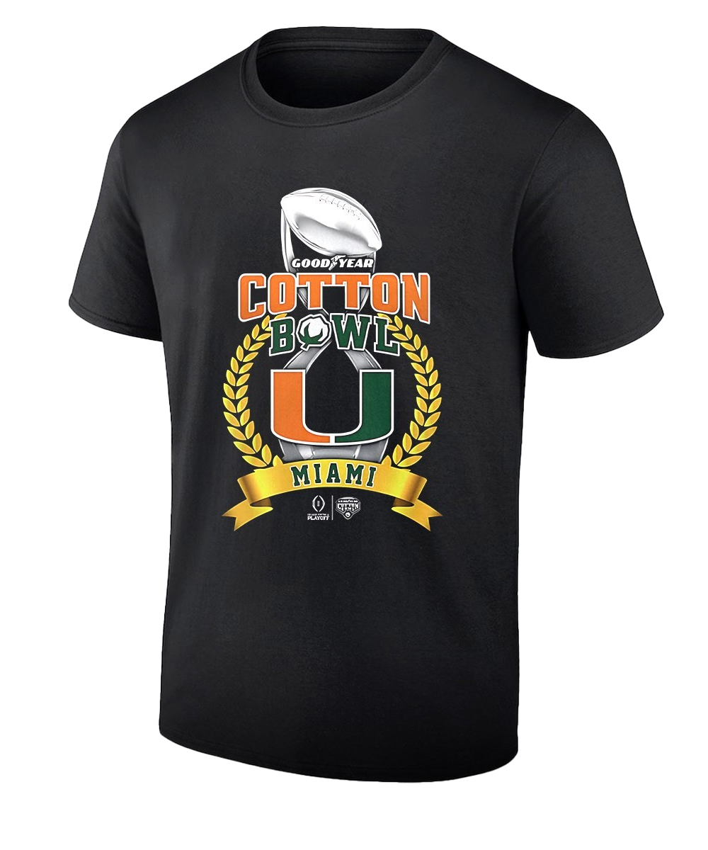Celebrate a championship victory with the Goodyear Cotton Bowl Champions Trophy T-Shirt. Honoring the Miami Hurricanes and their triumphant 2025–2026 season, this tee captures the pride, power, and achievement of lifting the Cotton Bowl trophy on the national stage.