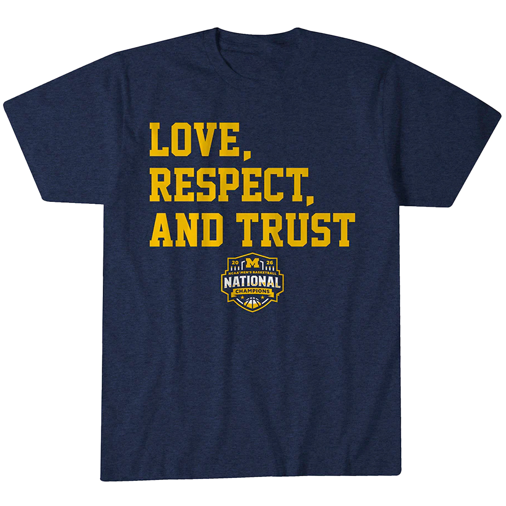 Featuring a bold “Love, Respect, and Trust – National Champions 2026” inspired graphic with Michigan Wolverines basketball elements, the design blends meaningful messaging with clean, standout fan style. Perfect for celebrations, game days, and loyal supporters, this shirt delivers comfort and championship pride.