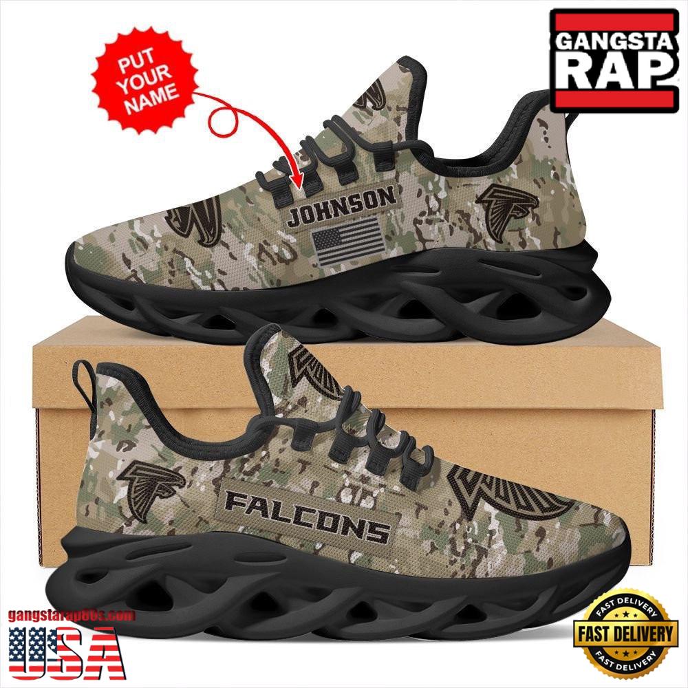 Step up your footwear game with the National Football League Custom Name Atlanta Falcons US Army Military Veteran Camouflage Air Max Shoes Air Cushion Sneakers and stand out wherever you go.