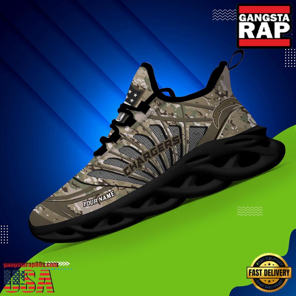 Step up your footwear game with the National Football League Custom Name Los Angeles Chargers Camo Veteran Day Air Max Shoes Air Cushion Sneakers and stand out wherever you go.