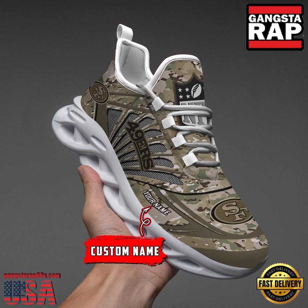 Step up your footwear game with the National Football League Custom Name San Francisco 49ers Camo Veteran Day Air Max Shoes Air Cushion Sneakers and stand out wherever you go.