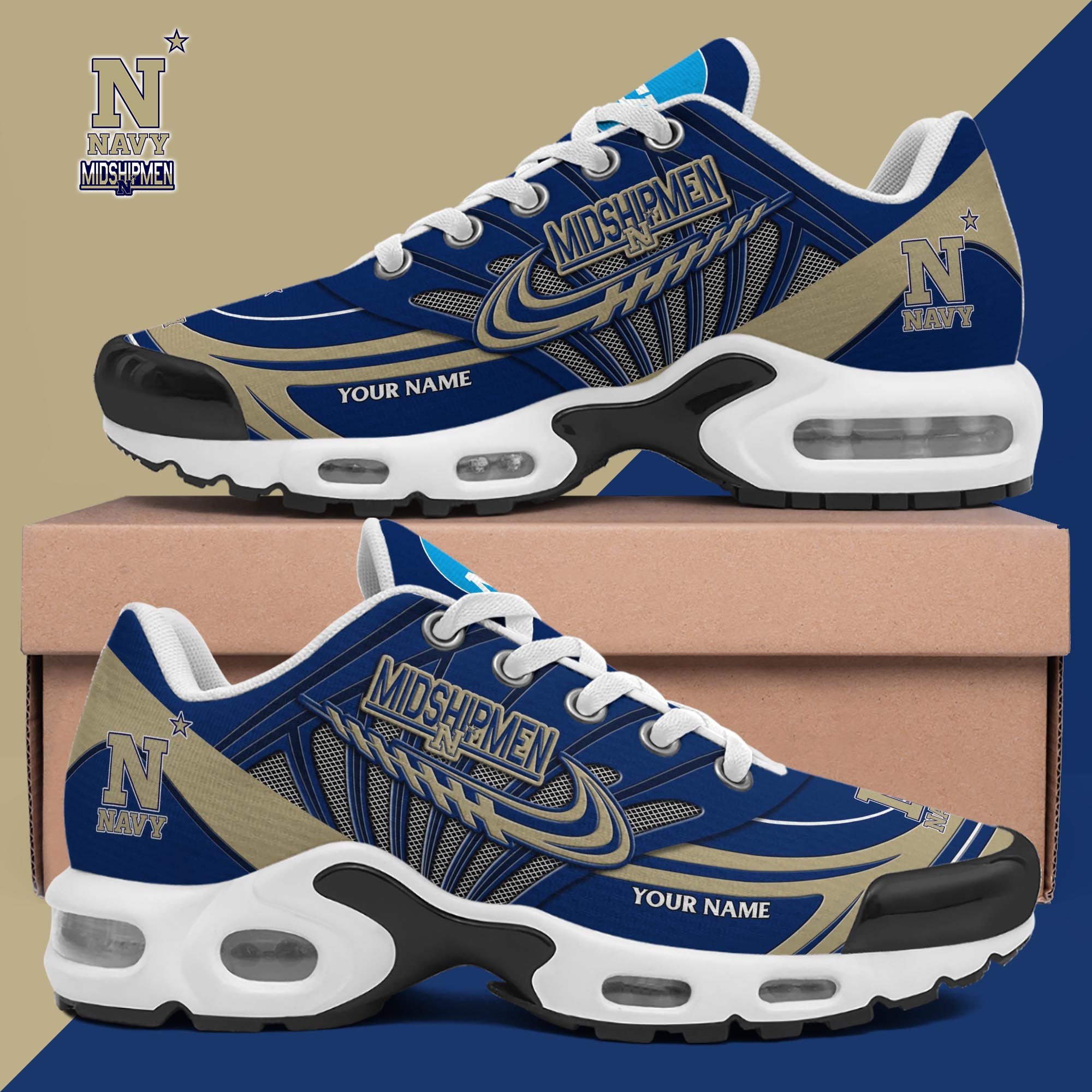 The Navy Midshipmen Shoes 2025 Version Custom Your Name 594 are a must-have for fans who love bold style and iconic design. Inspired by the unique theme and standout visuals, these sneakers feature eye-catching graphics combined with the signature Air Max silhouette.