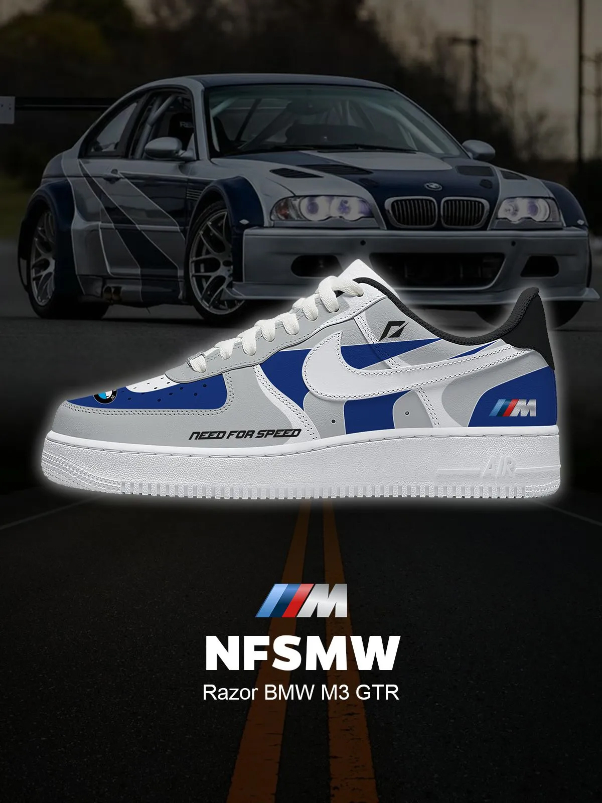 The Need For Speed Razor M3 GTR Air Force 1 Shoes Sneakers are the ultimate must-have for racing fans who remember the thrill of reclaiming the most iconic car in street racing game history. Inspired by Razor’s legendary BMW M3 GTR from Need for Speed: Most Wanted, these sneakers feature bold blue-and-silver racing graphics, high-contrast stripe detailing, and performance-inspired design elements that capture the adrenaline of high-speed pursuits and blacklist rivalries. Built on the timeless Air Force 1 silhouette, this pair blends gaming nostalgia with aggressive streetwear style.