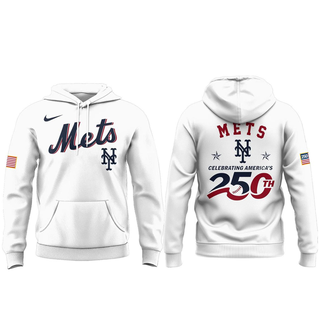 Celebrate baseball and history with the New York Mets 2026 Celebrating America’s 250th White Hoodie. Created to honor the 250th anniversary of the United States, this hoodie blends patriotic spirit with the proud tradition of Mets baseball. The clean white design highlights the special America 250 celebration while giving fans a timeless and stylish way to support their team.