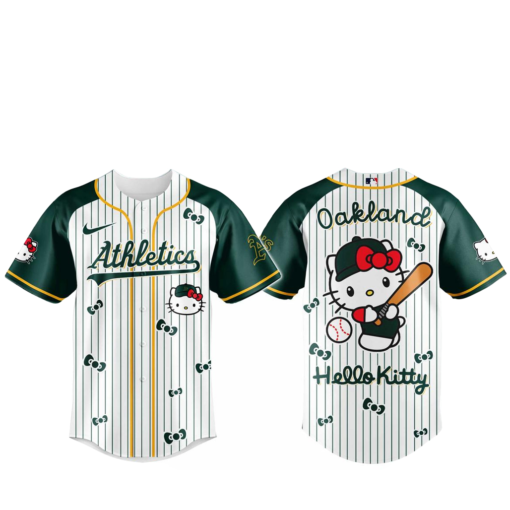 This special design blends the iconic identity of the Oakland Athletics with the beloved Hello Kitty aesthetic, creating a unique crossover piece that celebrates both baseball pride and character culture.