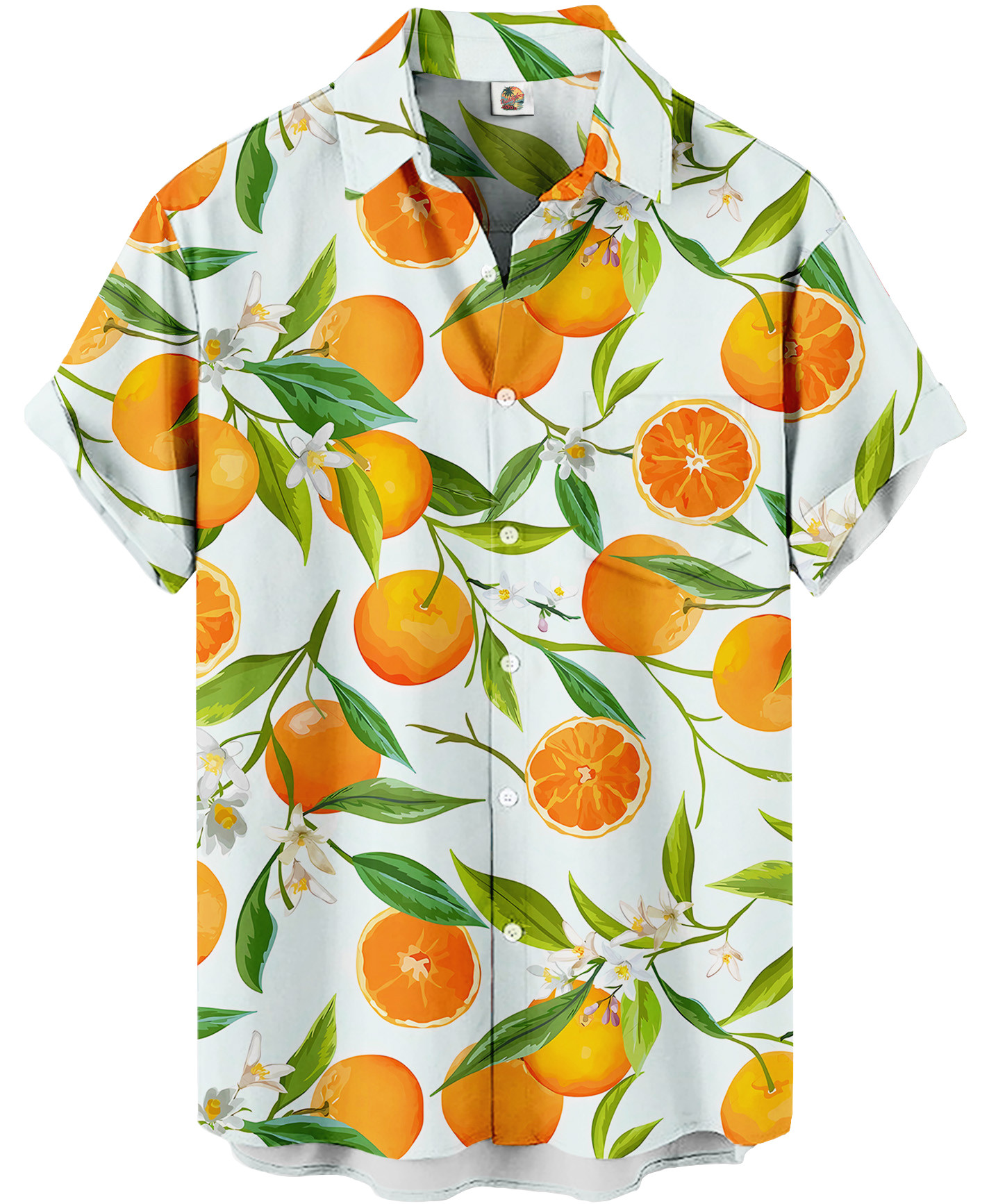 Unisex Hawaiian Shirt – Orange Citrus Print, Short Sleeve, Light Blue Background
