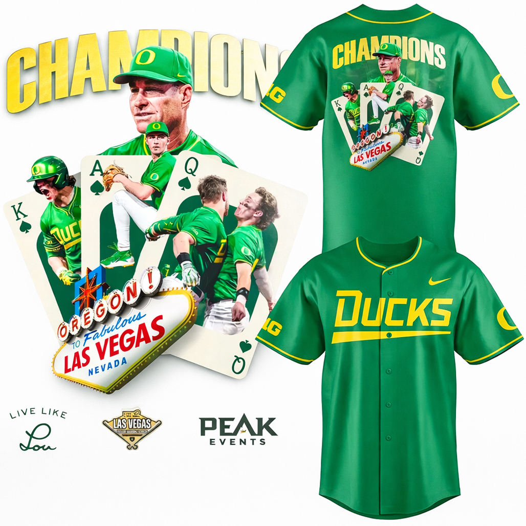 Bright lights. Big stage. Championship energy in the desert. The Oregon Ducks Champions Las Vegas 2026 Baseball Jersey captures the thrill of victory where neon meets green and gold — a bold tribute to a title run that turned Vegas into Duck territory.