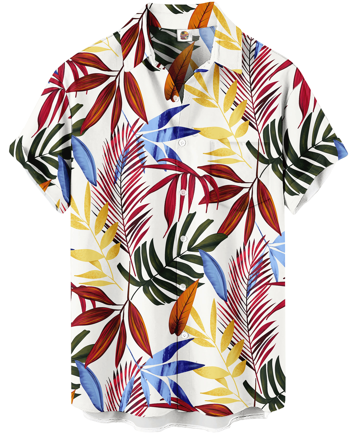 Bring vibrant island vibes to your wardrobe with the Unisex Tropical Print Hawaiian Shirt. Featuring colorful palm leaves on a crisp white background, this short sleeve button-down shirt blends tropical flair with casual comfort, perfect for beach outings, summer parties, or everyday wear.