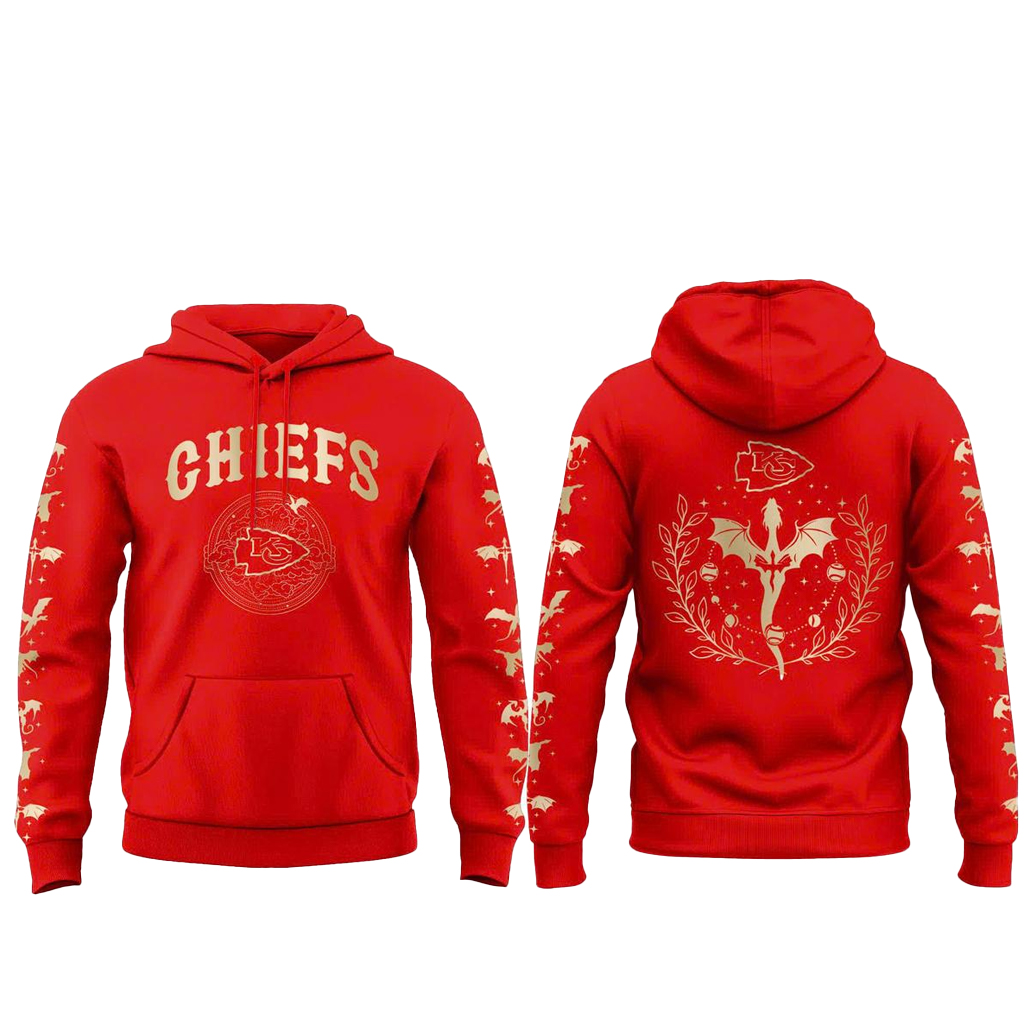 The red-themed design blends fantasy-inspired elements with Chiefs pride for a unique and powerful fan look.