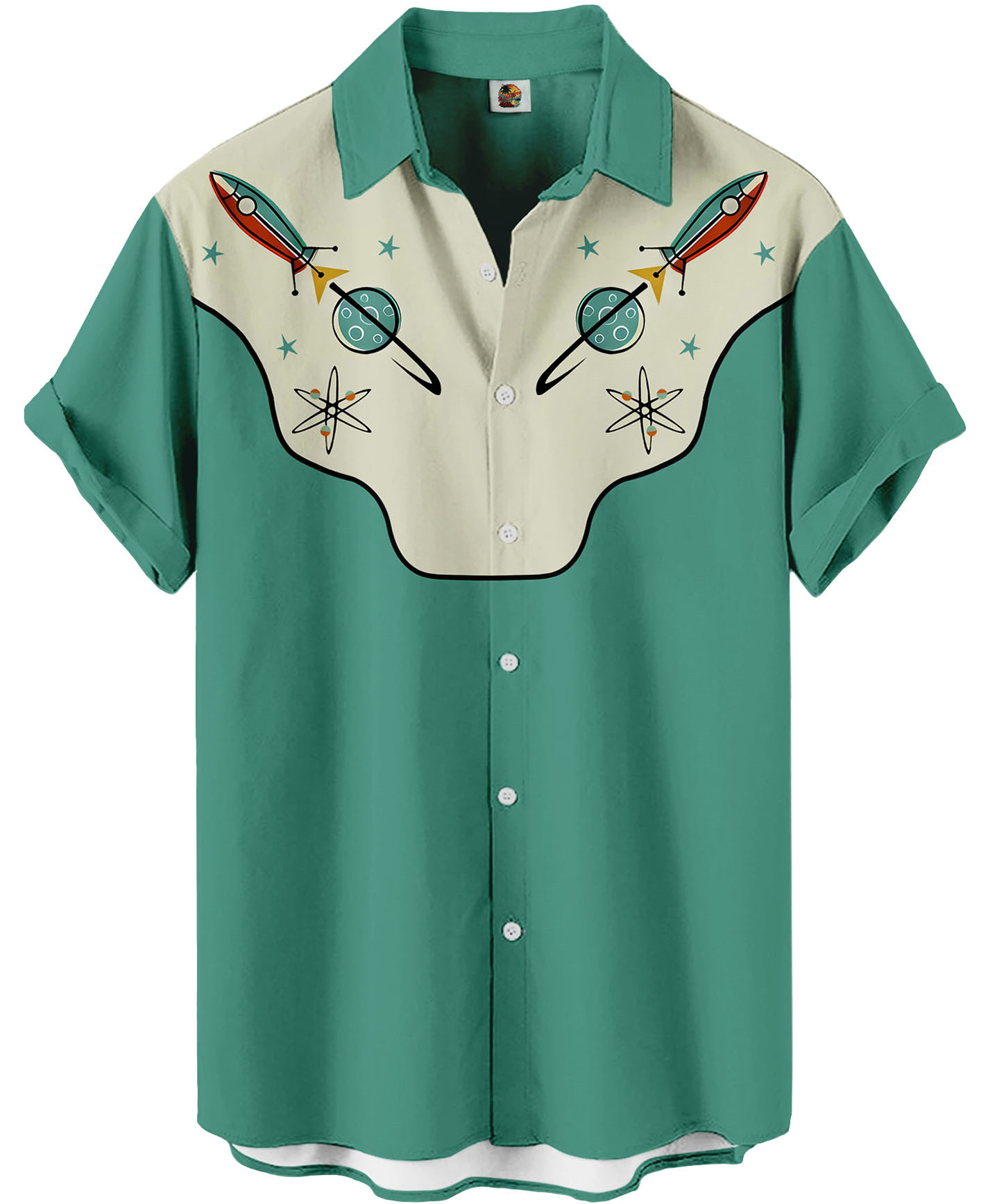 Unisex Retro Space Age Button Down Shirt – Mint Green with Rocket Print, Short Sleeve