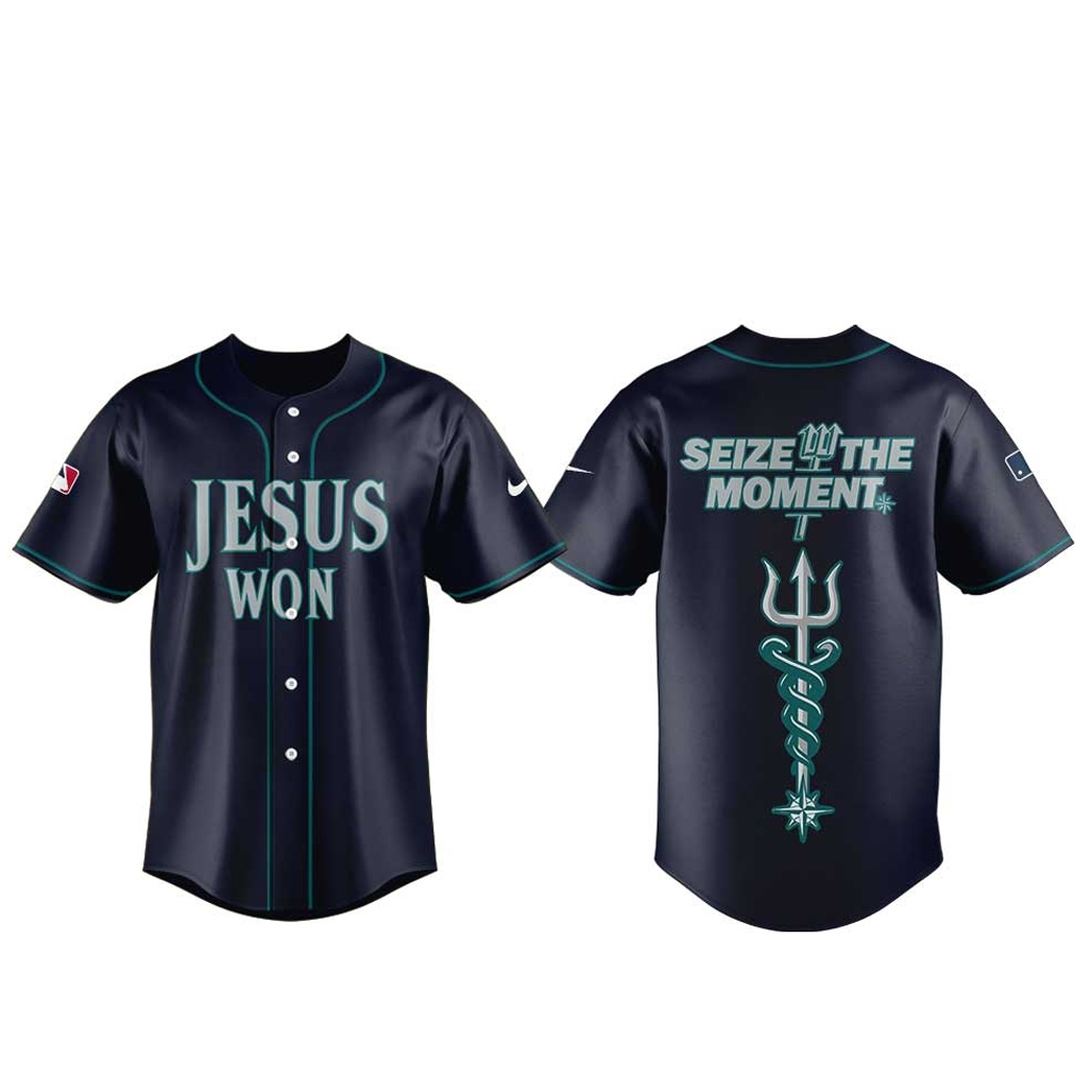 Make a powerful statement with the Seattle Mariners Jesus Won Seize The Moment Baseball Jersey.
