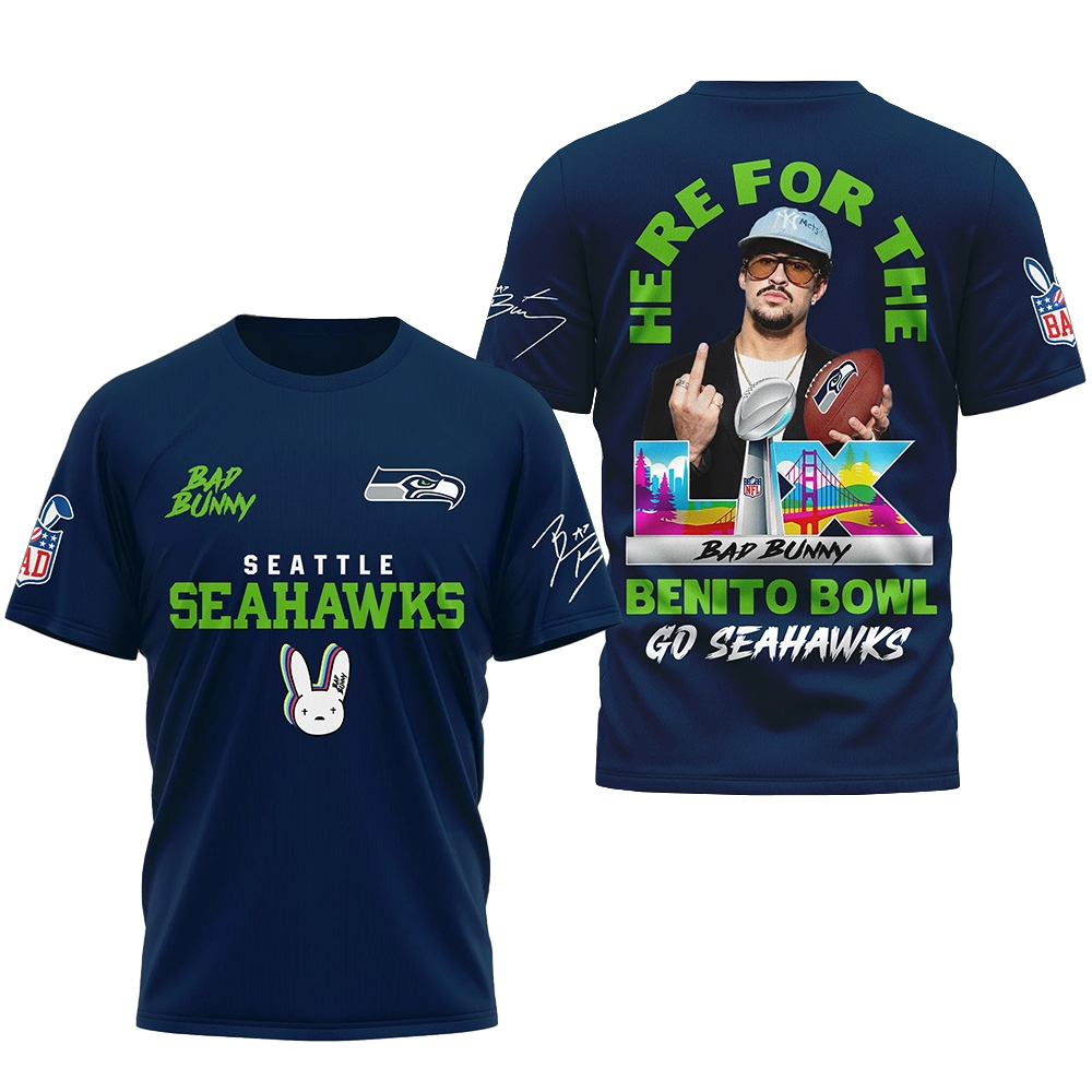 Crafted as high-quality printed apparel, this shirt features a striking Benito Bowl graphic alongside the Seattle Seahawks logo, combining Bad Bunny’s unforgettable performance energy with the unbreakable pride of the 12th Man. The durable, crisp printing ensures both the excitement of the Benito Bowl and your Seahawks pride remain vibrant through every wear.