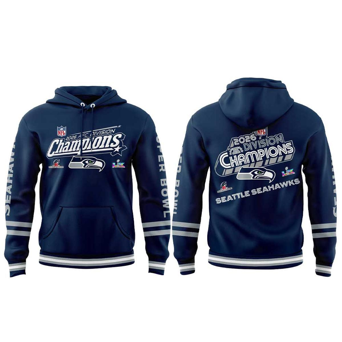 Graphic: High-impact front print celebrating the Seattle Seahawks as 2026 AFC Division Champions on their Super Bowl run