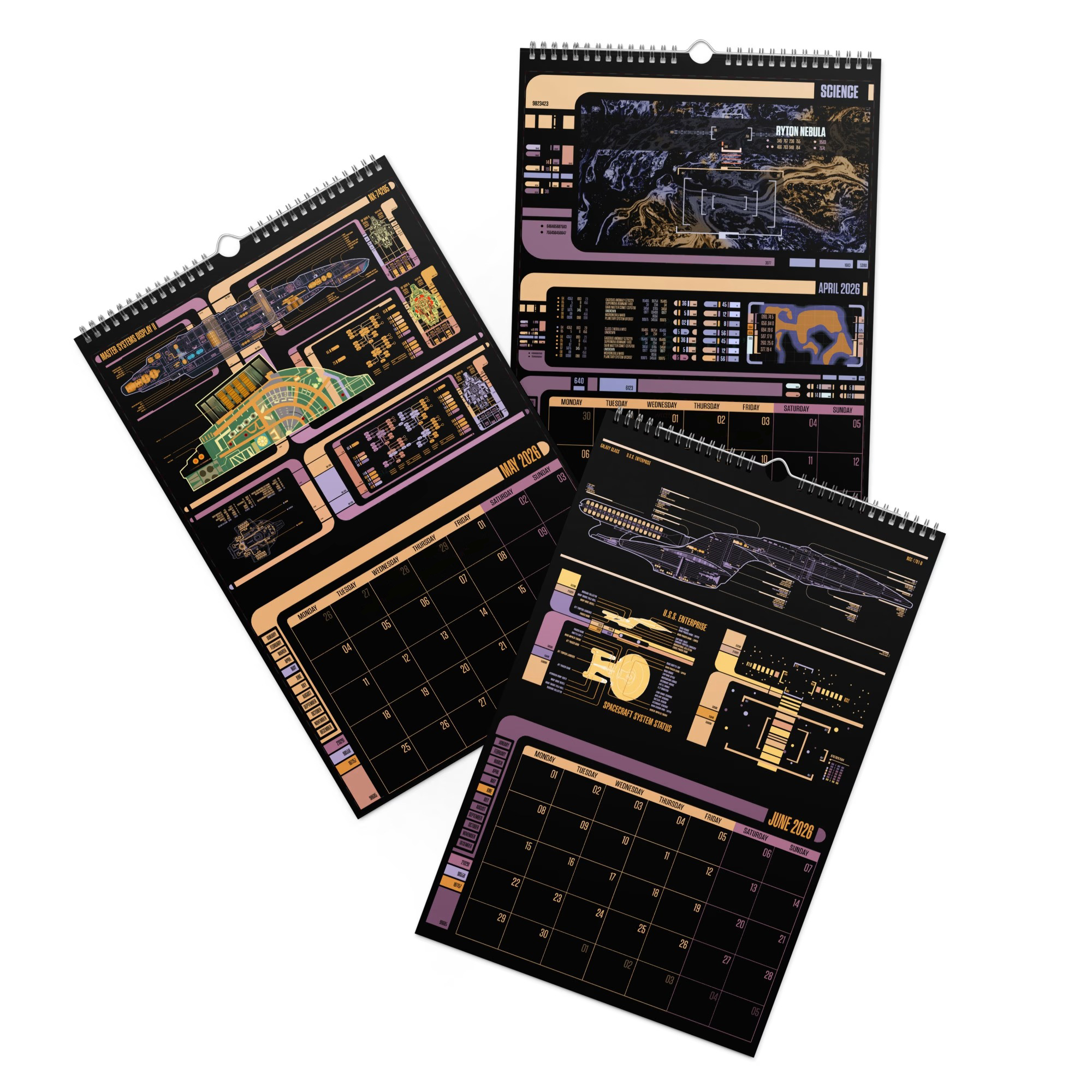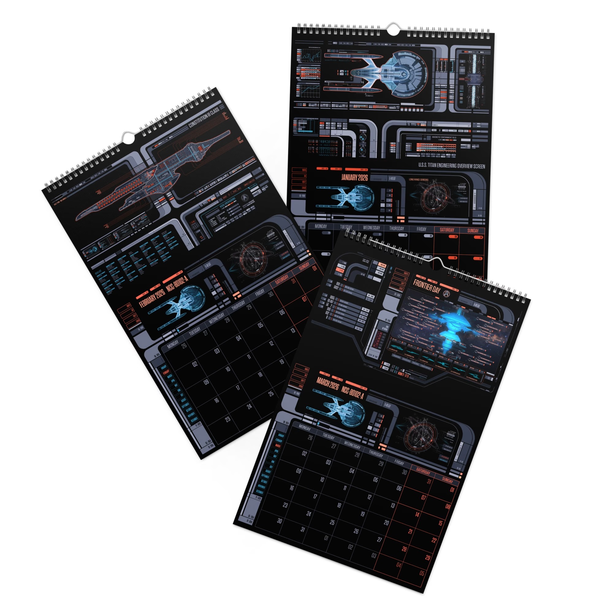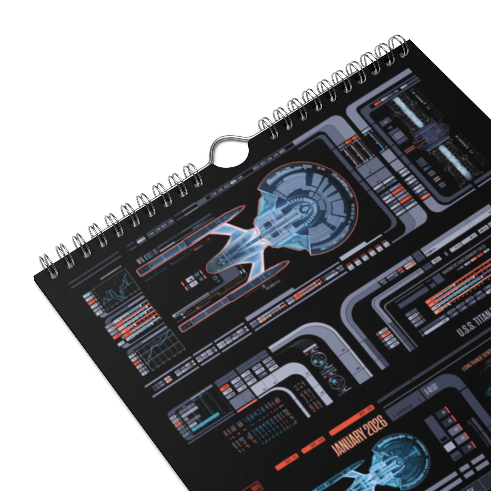 Designed for devoted Trekkies, this premium wall calendar brings the sleek colors, panels, and futuristic readouts of Star Trek’s most recognizable UI straight to your wall.