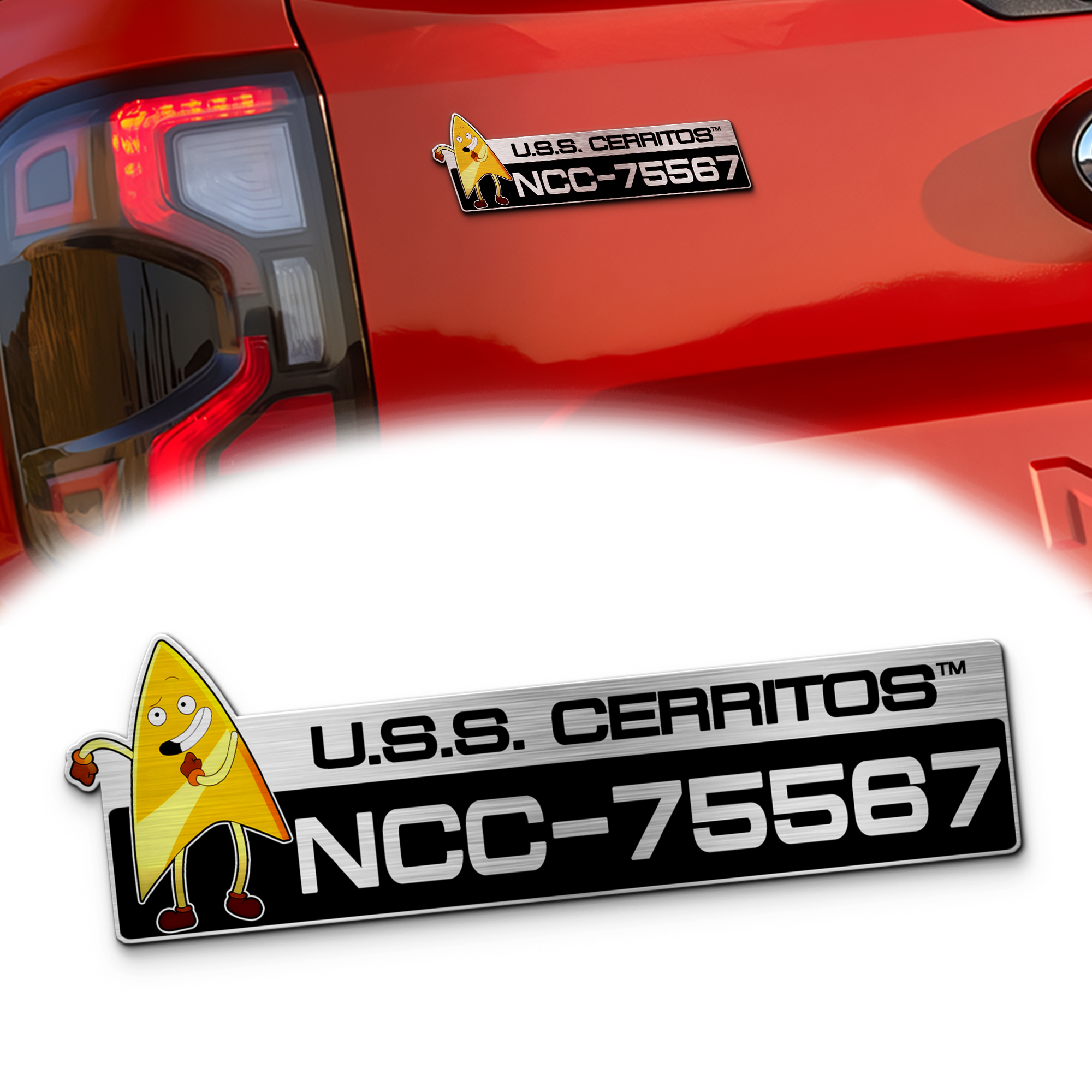 Show off your Lower Decks pride with this laser-engraved U.S.S. Cerritos NCC-75567 car emblem, designed for Starfleet officers who know that second contact is just as important as the first! Whether you’re on a warp-speed commute or just cruising through town, this emblem brings Federation flair and California-class charm to your vehicle.