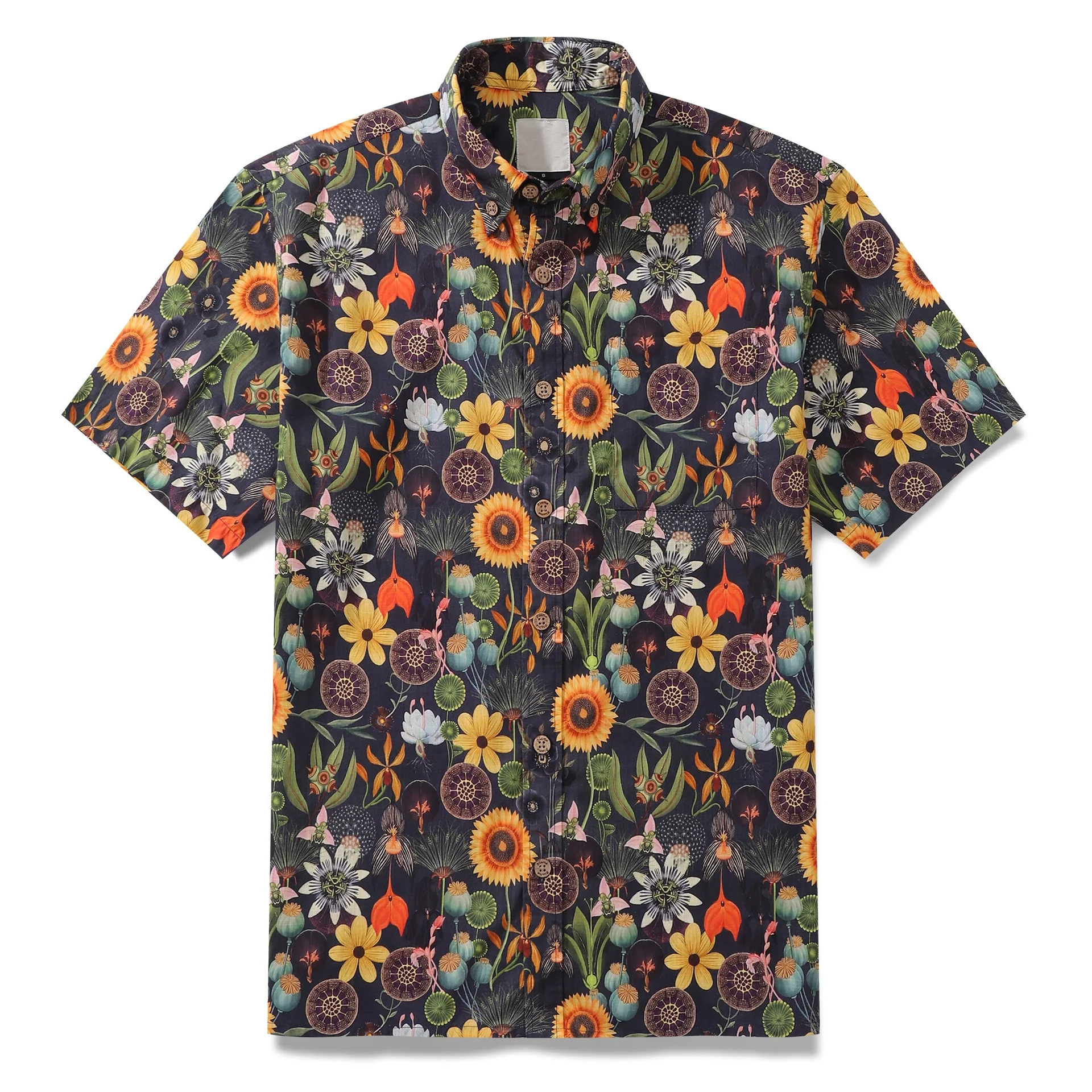 This high-quality Hawaiian shirt features a stunning floral print of bright sunflowers set against a tropical backdrop. The cheerful yellow blooms and rich green foliage instantly bring a sense of warmth and serenity, evoking feelings of summer and sunshine. If you’re a fan of floral prints and love the idea of combining nature with style, this shirt is made for you.