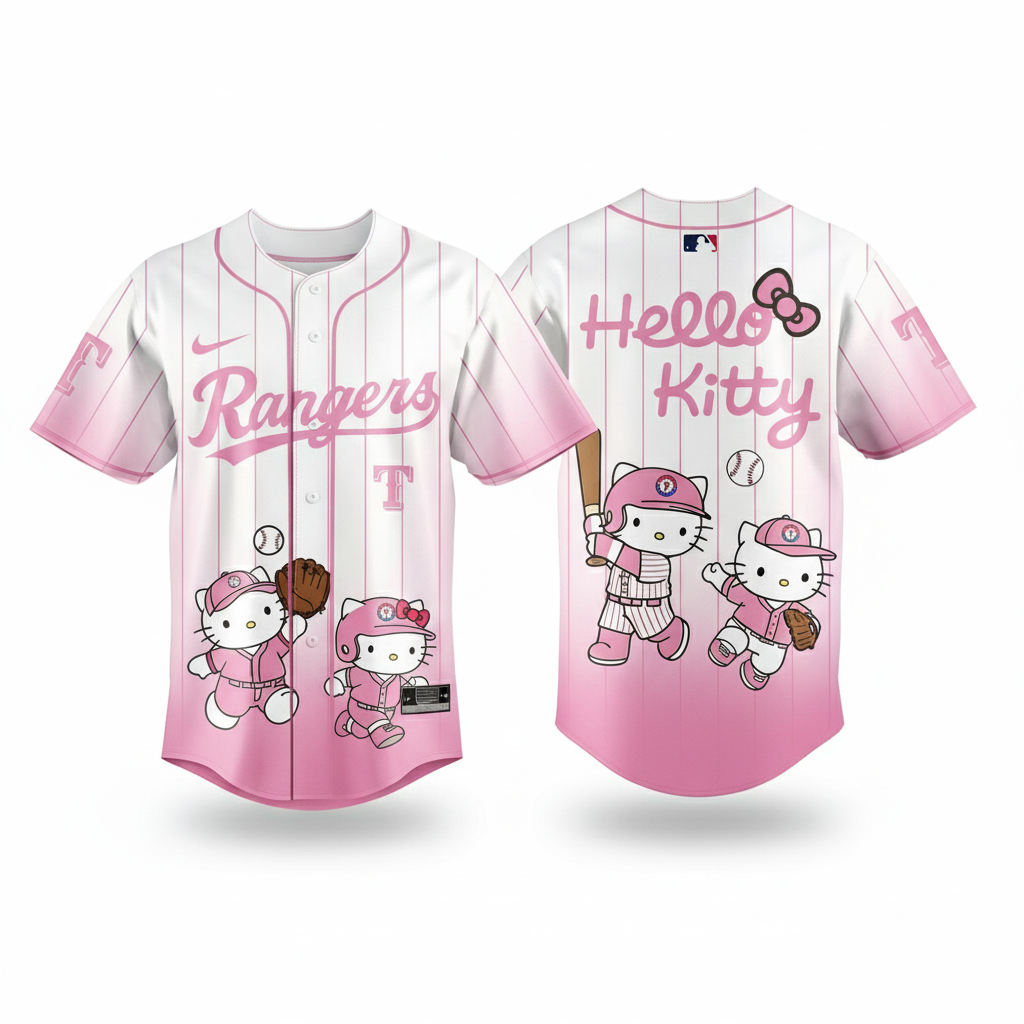 Step into playful style with the Texas Rangers Hello Kitty Night 2026 White Pink Baseball Jersey. This charming design blends Rangers pride with the adorable Hello Kitty aesthetic, creating a sweet and eye-catching look for fans who love cute vibes and standout fashion.