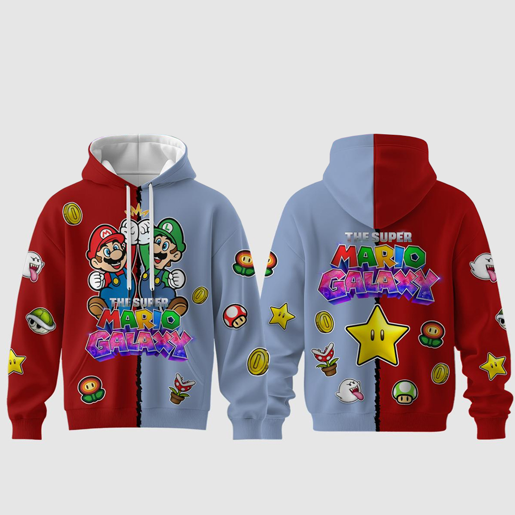 Level up your everyday style with The Super Mario Galaxy Movie 2026 Mario x Luigi Hoodie.